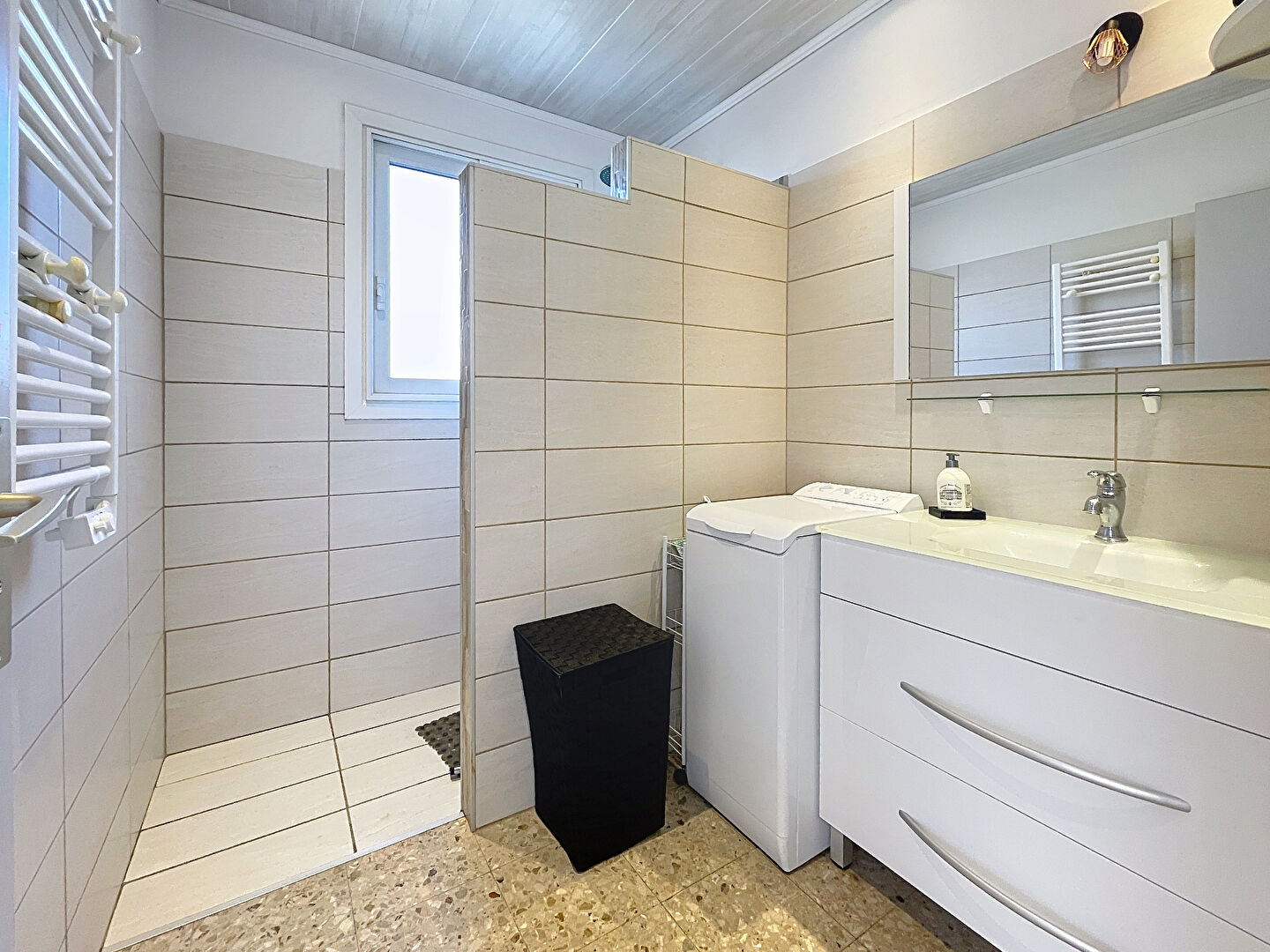 Au rez de chaussée, un T2 d'environ 50 m2 avec une pièce à vivre ouverte sur un espace cuisine équipée, un couloir desservant une chambre et une salle d'eau (double vasque et douche à l'italienne).