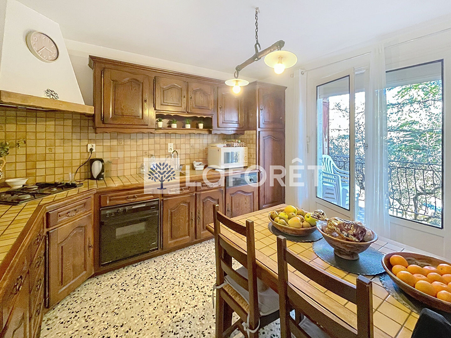 Une cuisine de 13 m² avec accès à une terrasse de 12 m²,