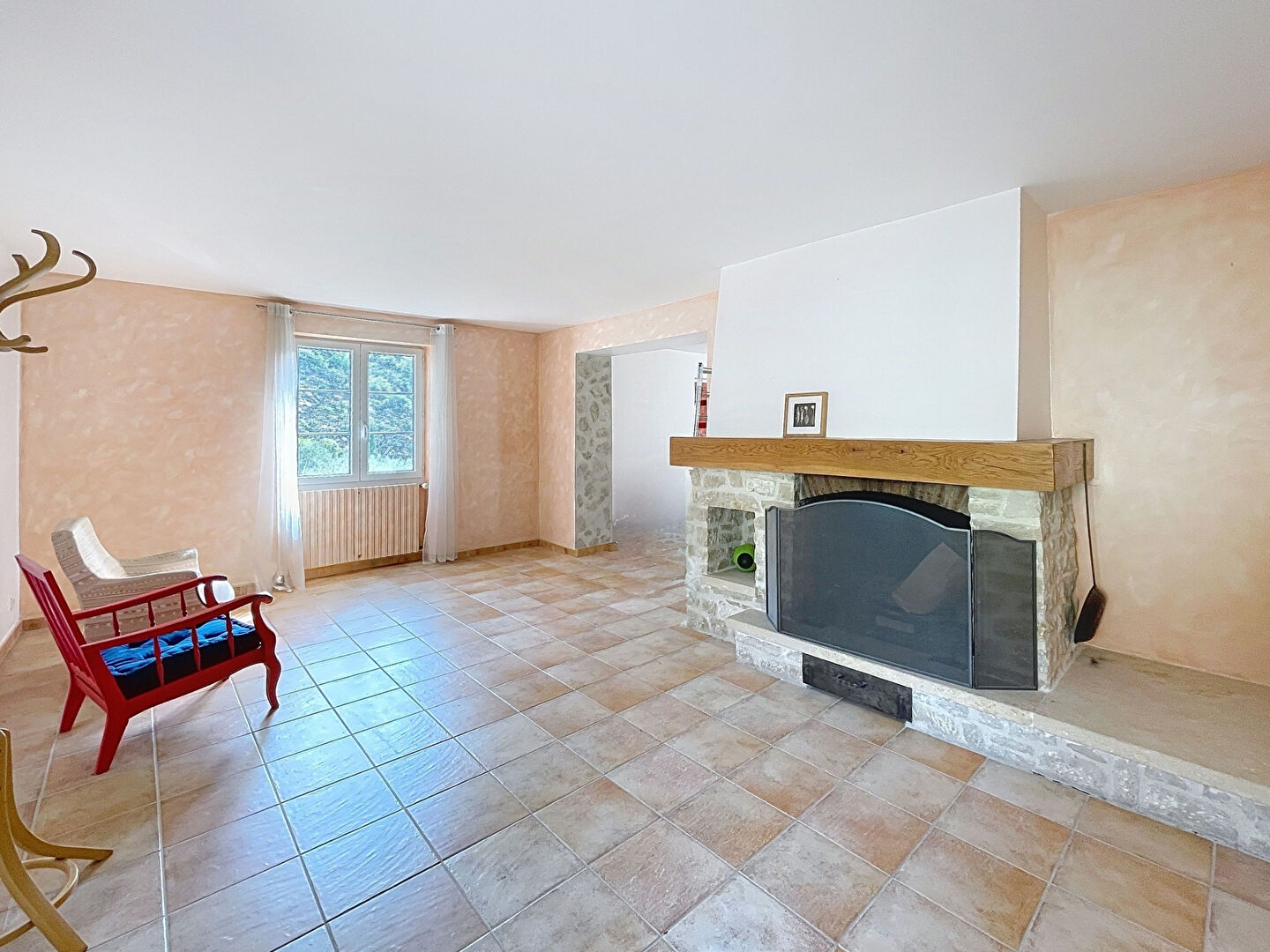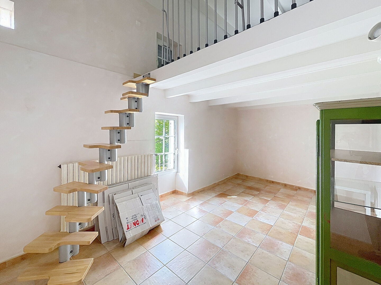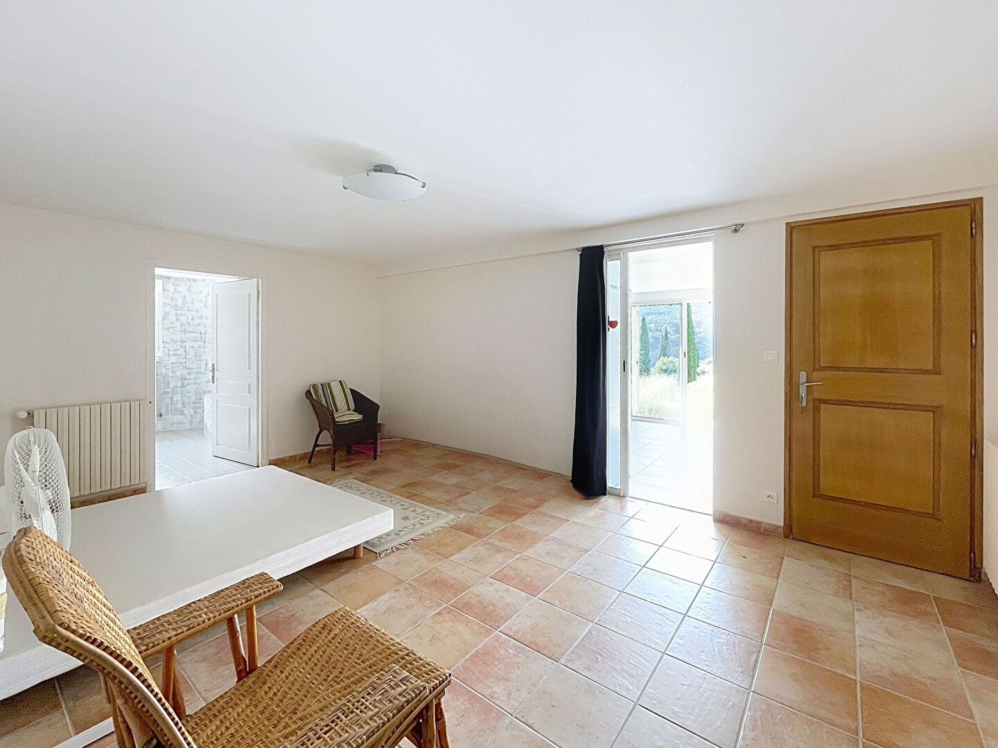 En face, une maison de gardien entièrement rénovée offre une grande pièce de vie ouverte sur terrasse, chambre et salle d'eau, alliant charme et indépendance.