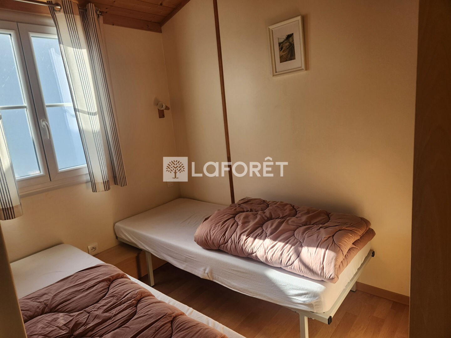 Cette maison en ossature bois se compose : d'une terrasse couverte de 18m2, d'un salon/kichnette, de 2 chambres, d'une salle d'eau avec wc. 2 cabanons pour le rangement.
