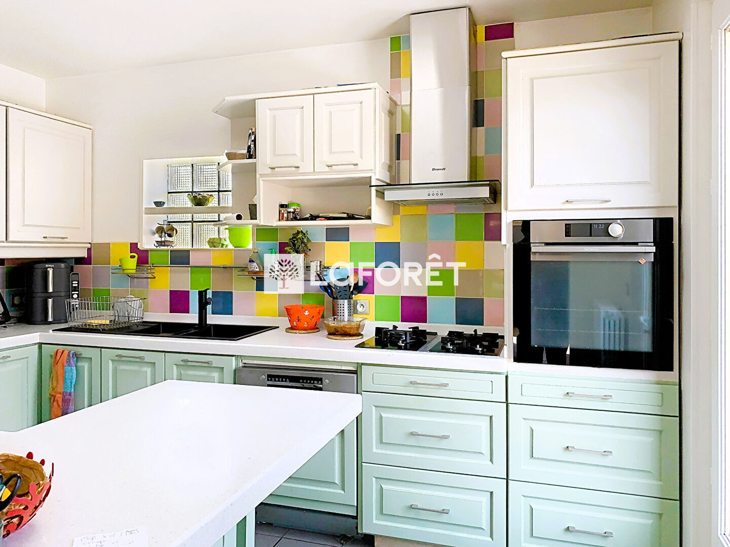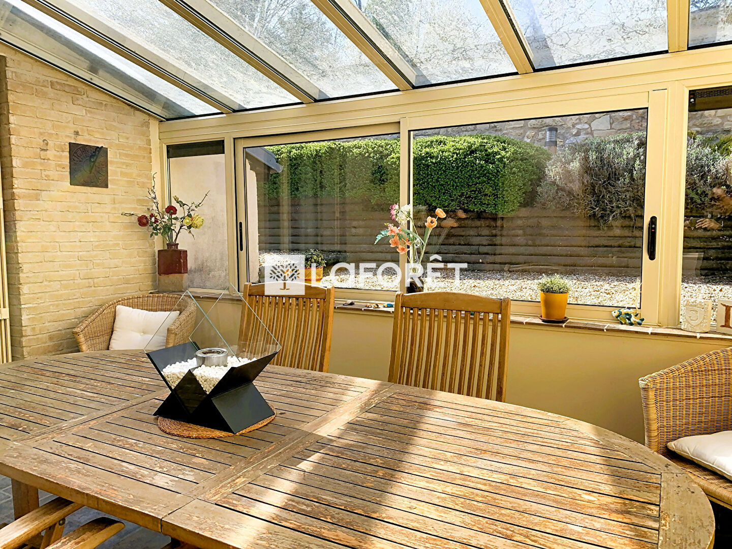 La cuisine est aménagée et équipée avec accès direct sur la terrasse. Belle véranda de 14 m².