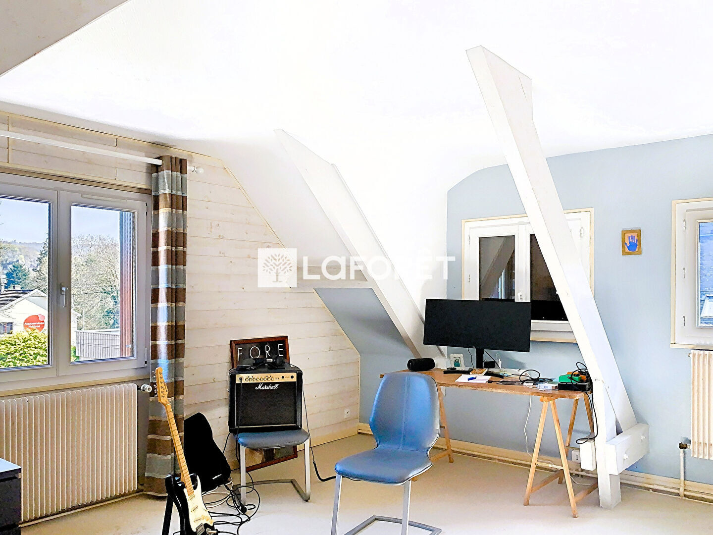 Une seconde chambre vient compléter cet étage du bien. Grâce à un magnifique escalier nous arrivons au premier étage, accueillis par un palier qui dessert deux chambres ainsi qu'une salle de bains avec lave linge et wc.