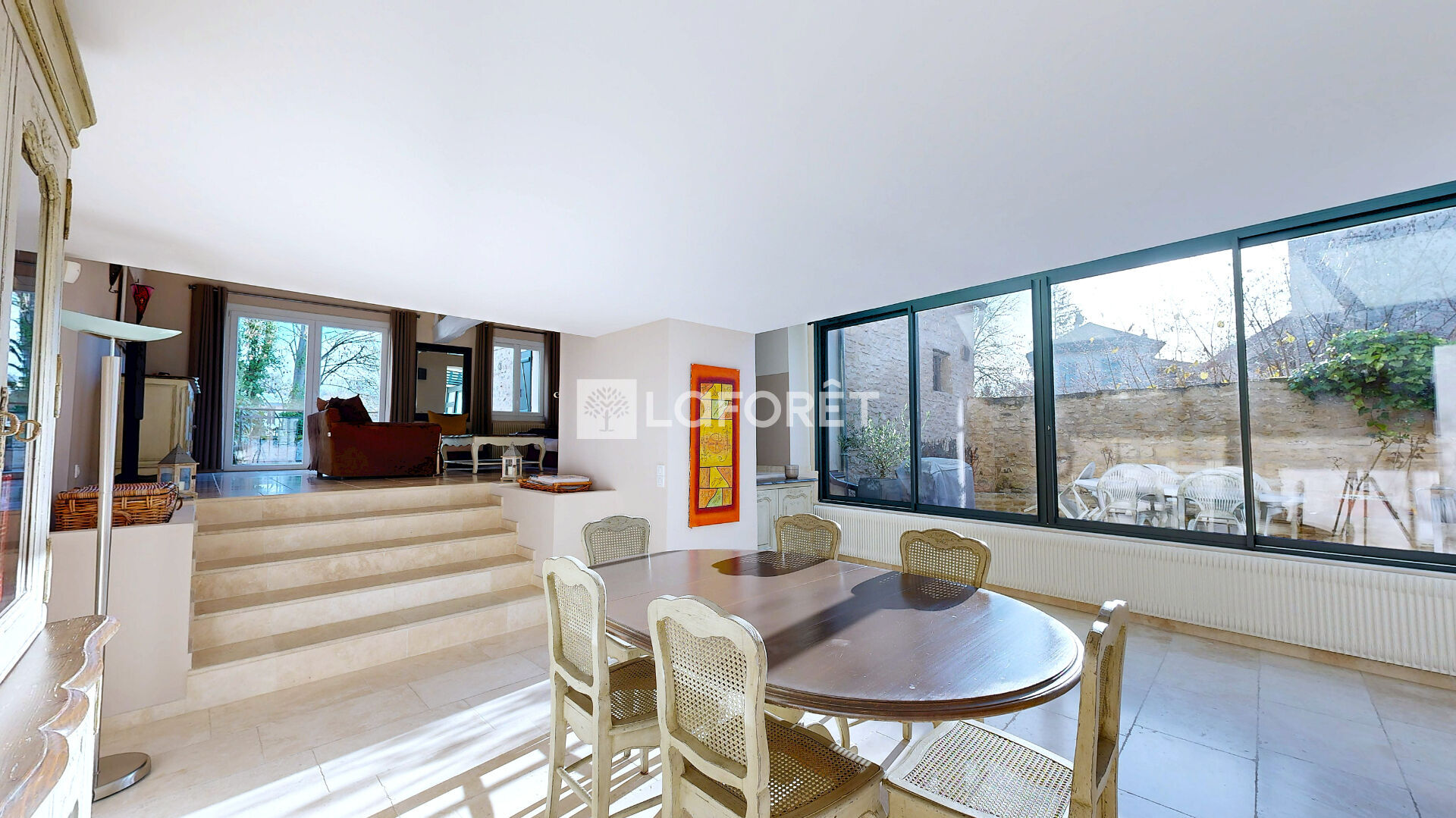 On entre par la cour pavée dans une très belle pièce faisant actuellement office de salle à manger et jouissant d'une superbe luminosité grâce à l'avancée de la véranda sur la cour. Quelques marches plus haut nous mènent au séjour agrémenté d'une belle cheminée et donnant sur une petite terrasse avec vue sur le jardin.