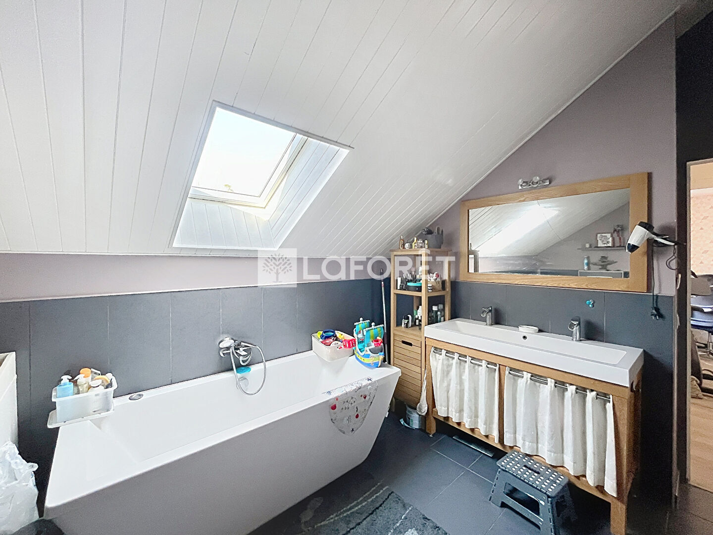Elle se compose d'une belle entrée avec des rangements, une pièce de vie avec un poêle à bois, cuisine ouverte aménagée et équipée, 2 belles chambres dont une avec une petite mezzanine, une salle de bains spacieuse avec douche, baignoire et wc, une buanderie et un wc indépendant.