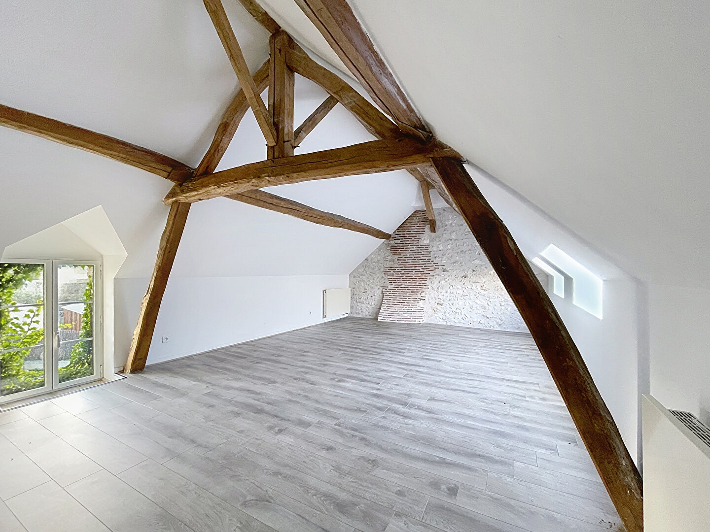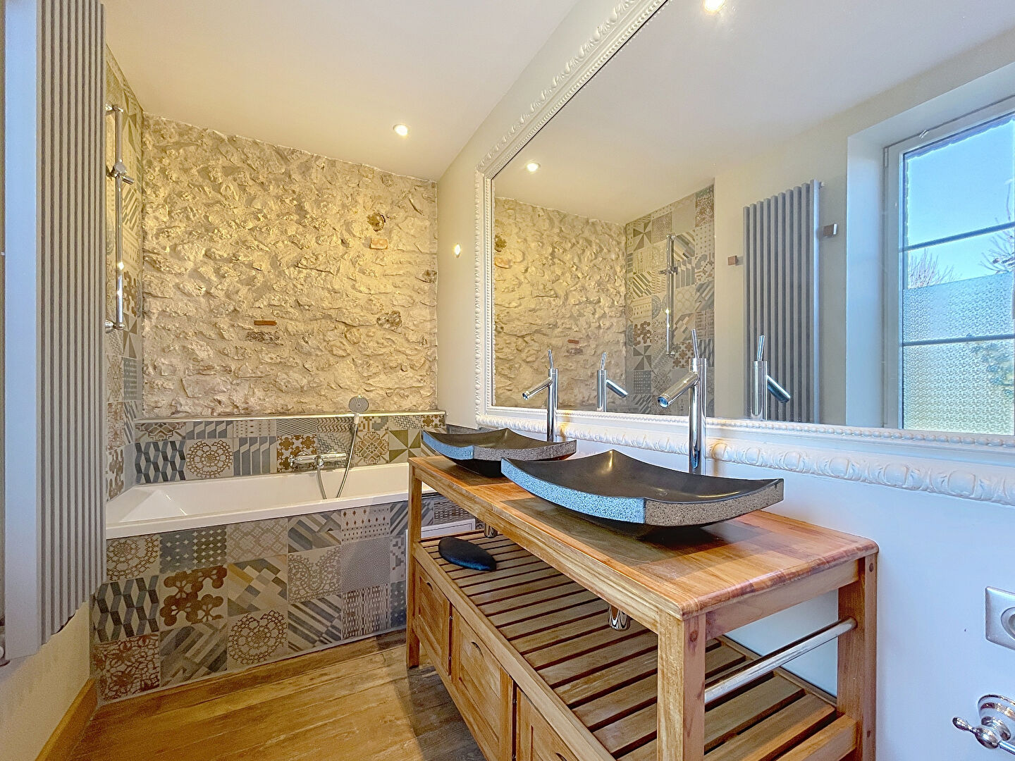 Au premier étage, on retrouve un salon de 37m² disposant de sa cheminée, suivi d'une grande salle de jeux ainsi que trois autres chambres et une salle de bain, également rénovées, marquées par les parquets anciens, cheminées, pierres et poutres apparentes.