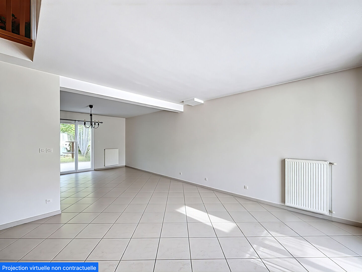 Au RDC : entrée, séjour, salle à manger et cuisine ouverte équipée (environ 42 m²), arrière cuisine donnant la fois sur la jardin et dans le garage. Une chambre avec placard (ou bureau) et un cabinet de toilette.