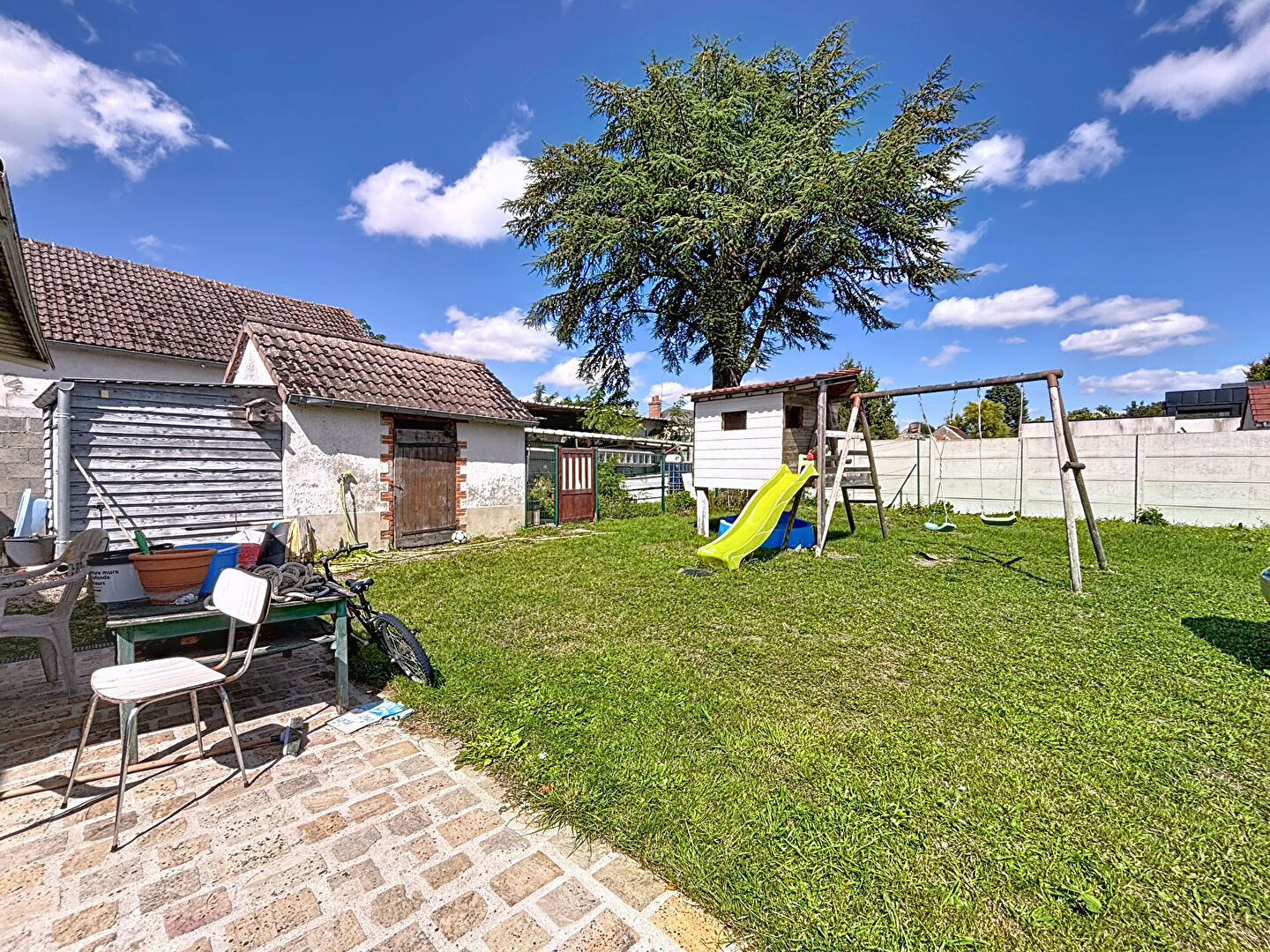 Terrain de 1169 m² clôturé avec une dépendance et un parking permettant de garer plusieurs voitures.