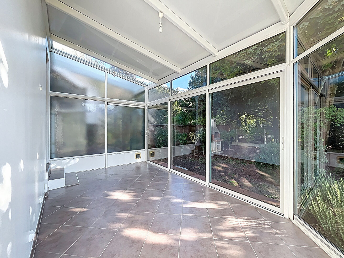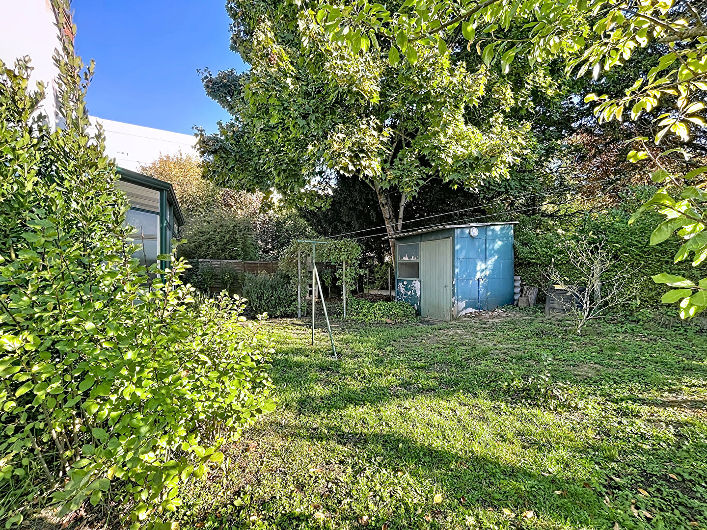 Charmant jardin arboré (parcelle de 412 m²) avec barbecue maçonné et abri de jardin.