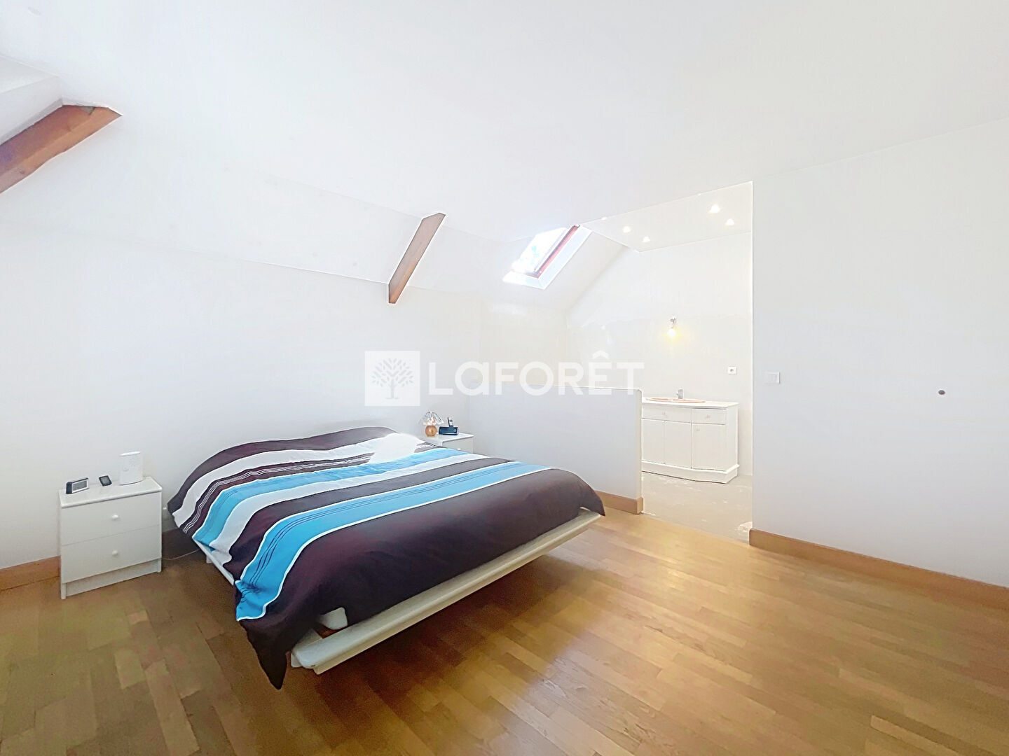 À l'étage, un dégagement dessert une salle de bains indépendante, un W.C. séparé, trois chambres spacieuses ainsi qu'une suite parentale avec salle de bains privative. Trois placards intégrés offrent des espaces de rangement pratiques.