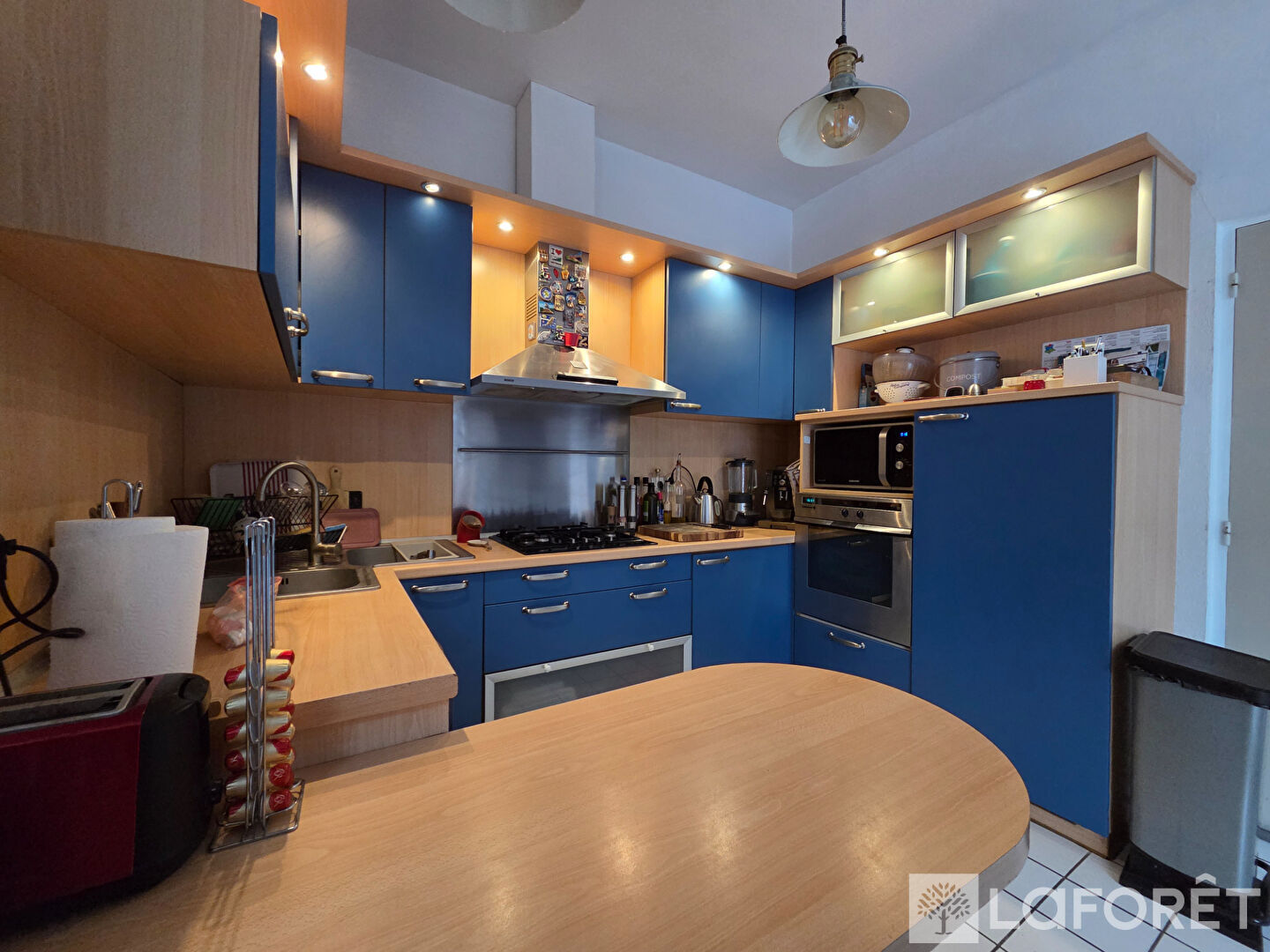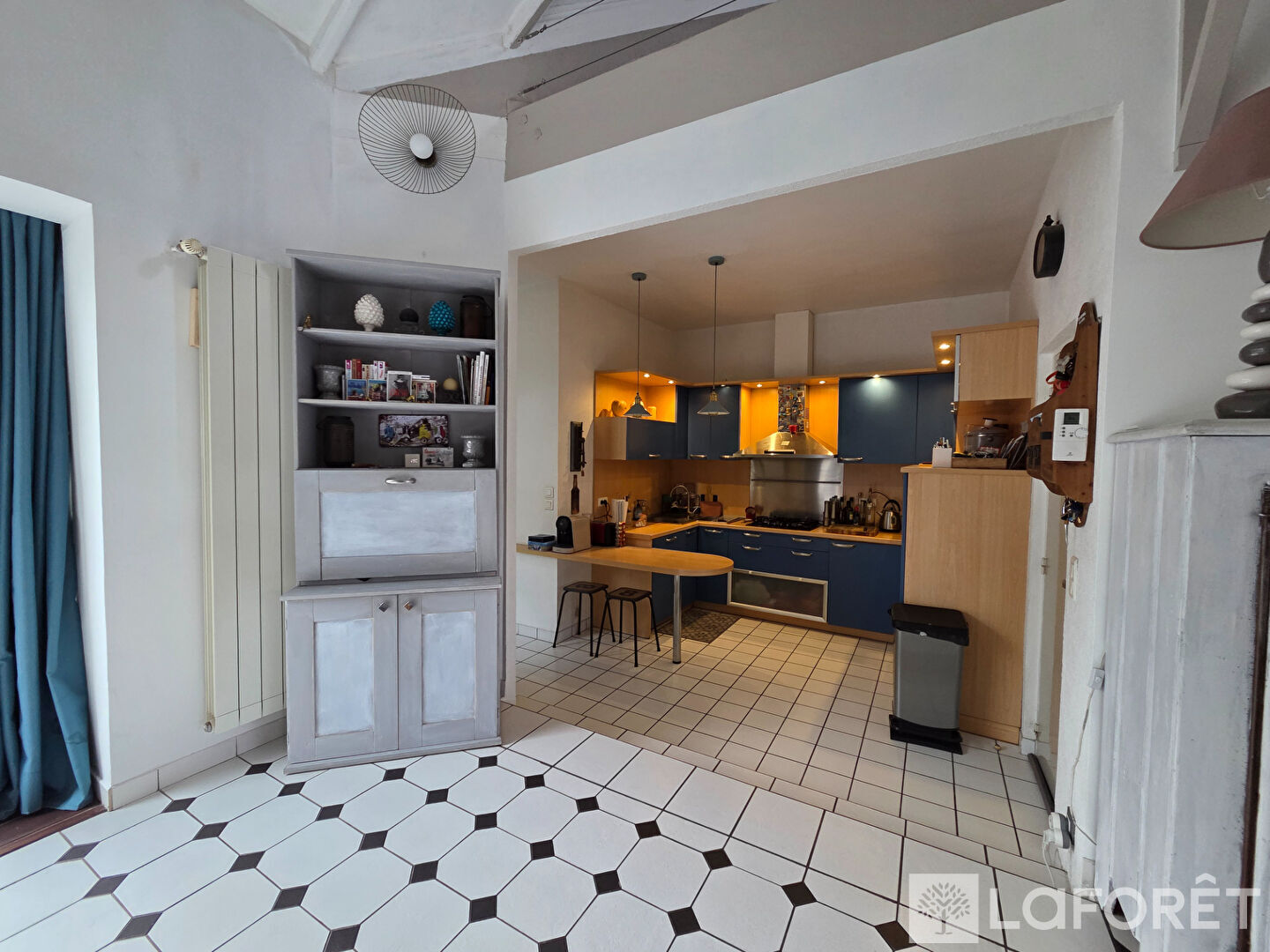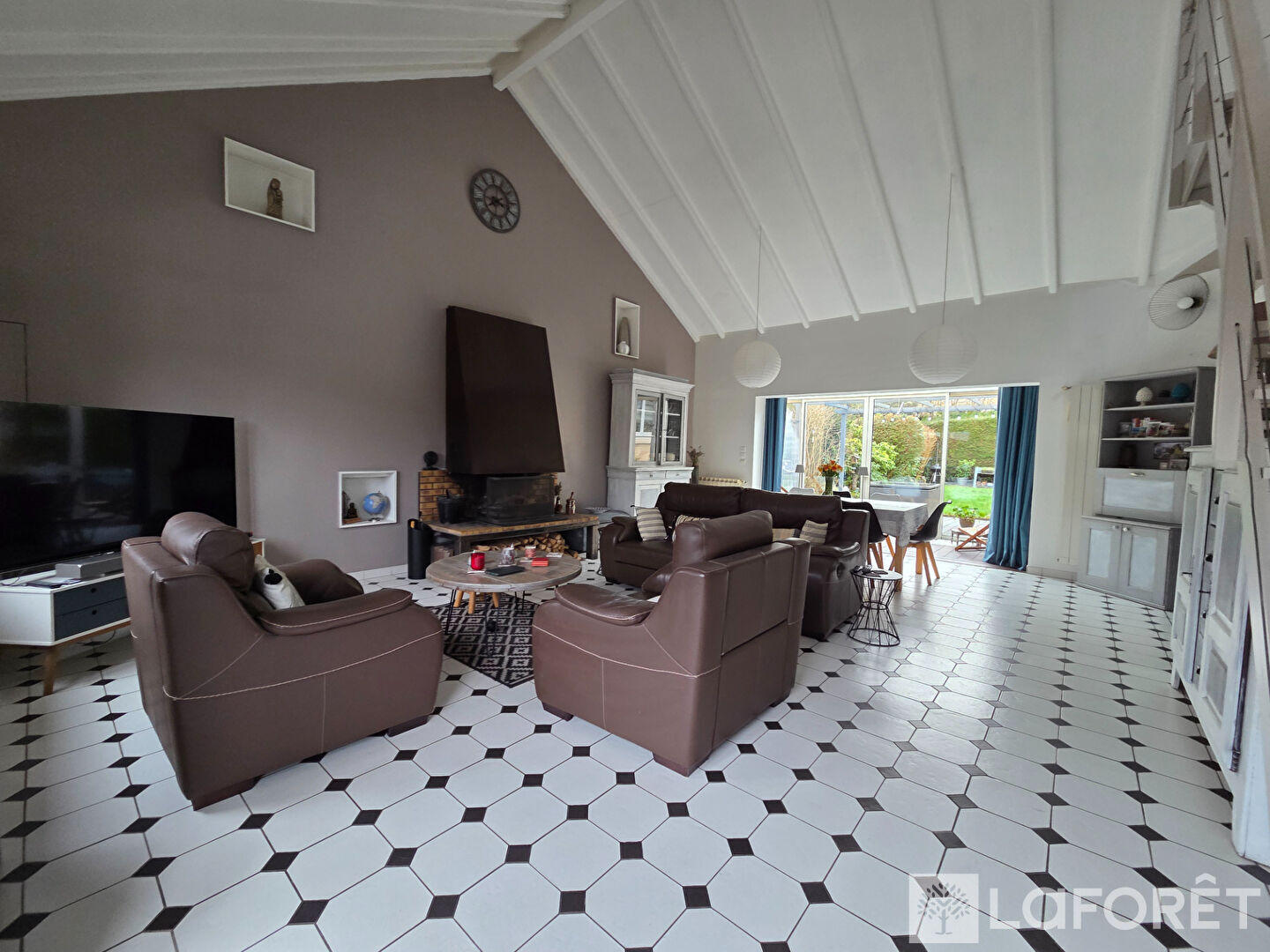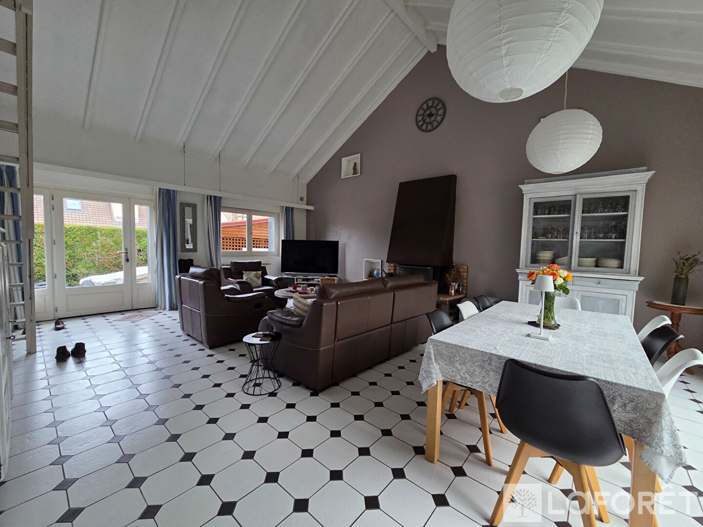 Elle offre un vaste séjour cathédrale baigné de lumière, agrémenté d'une cheminée, ainsi qu'une cuisine entièrement équipée.