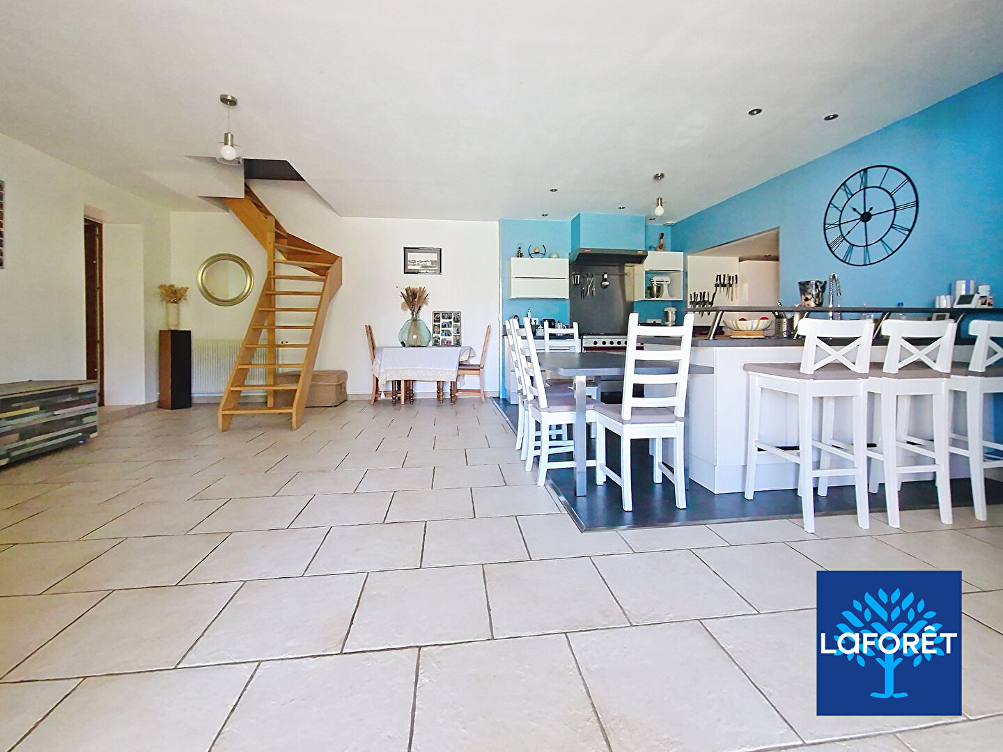 De plain-pied, Vous apprecierez des pièces de vie spacieuses et lumineuses. Les espaces intérieurs marient avec harmonie le charme de l'ancien et le confort contemporain. Bienvenue dans le salon-séjour et la vaste cuisine ouverte avec cheminée insert qui invite à la convivialité. Une buanderie attenante et atelier-cave. Toilettes. Les larges ouvertures sur le jardin et la terrasse révélent une atmosphère apaisante.