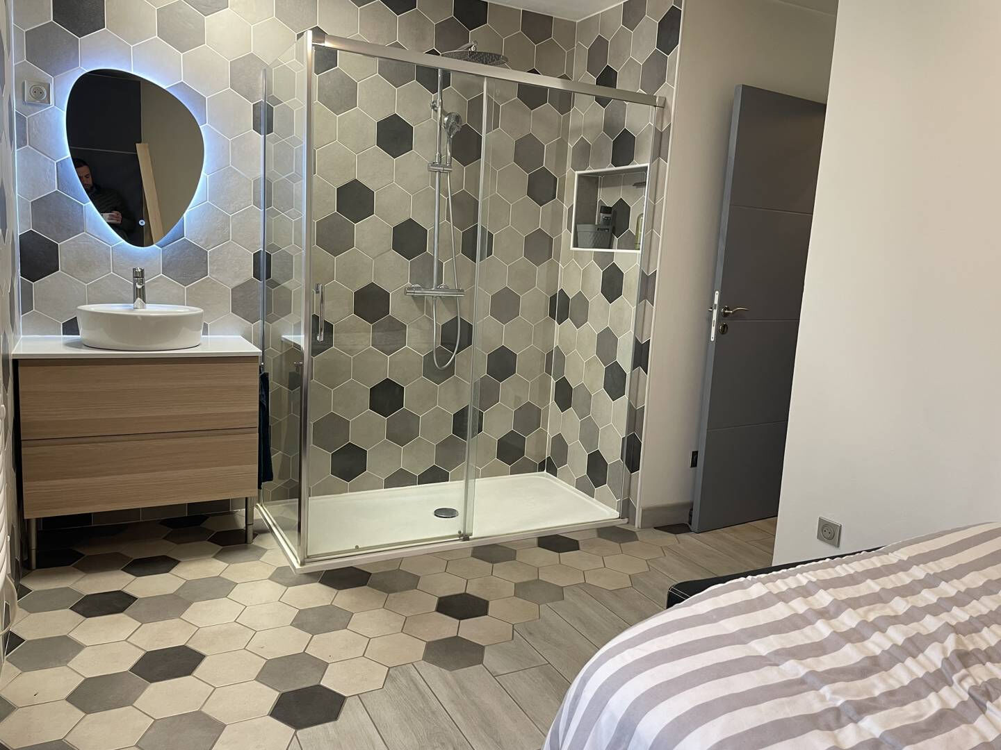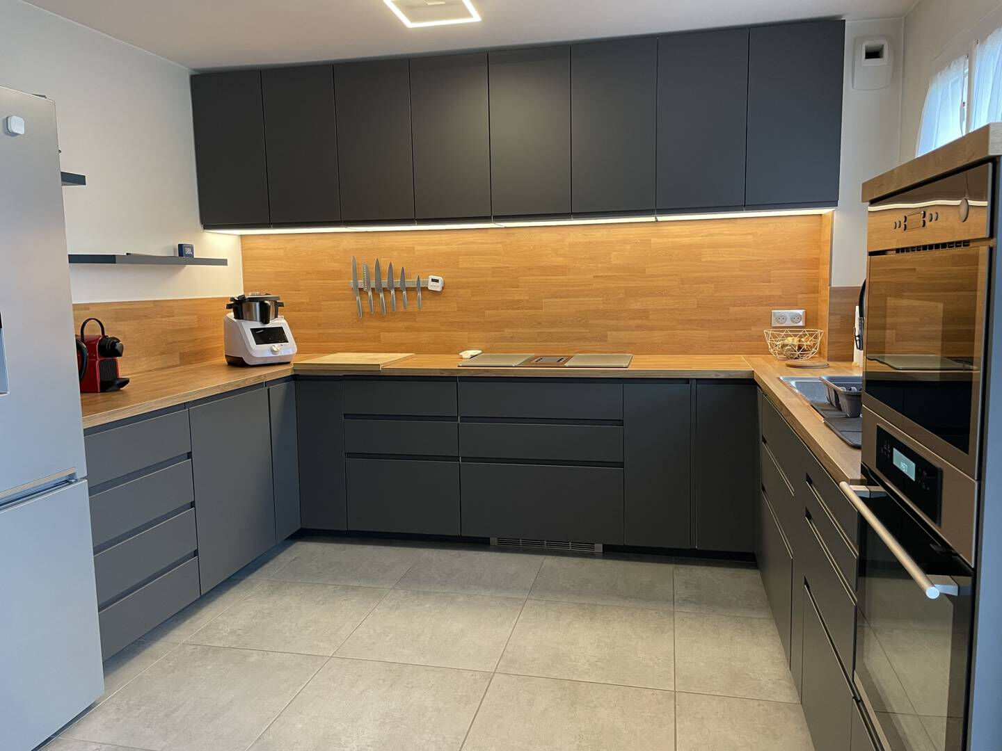 Une cuisine ouverte, aménagée et équipée, donnant sur une salle à manger conviviale.