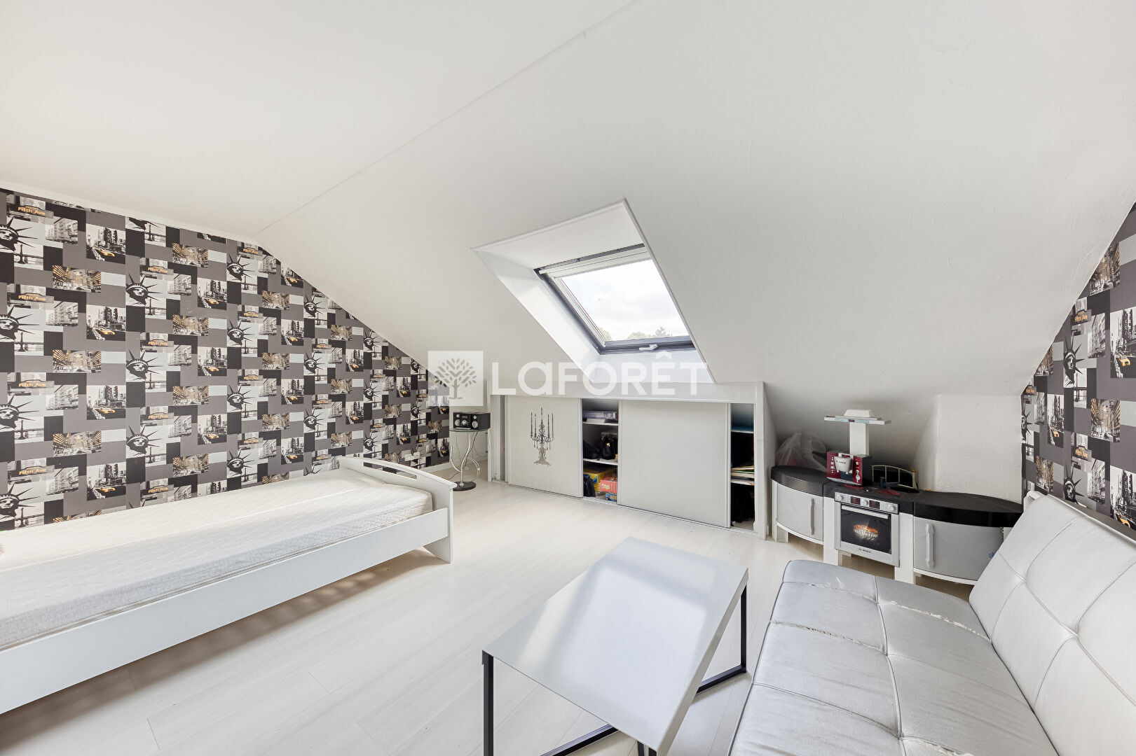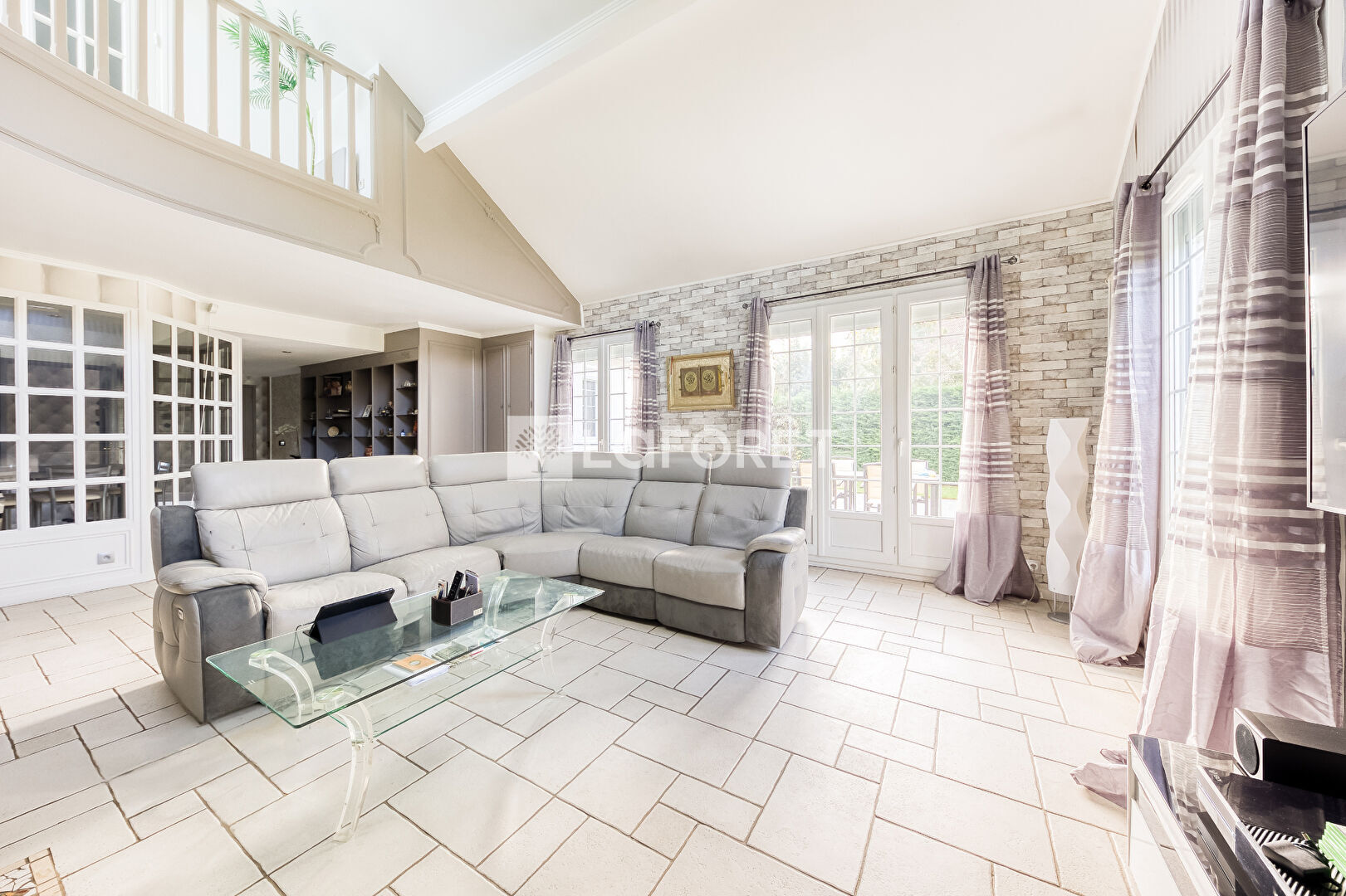 À l'étage, les combles sont aménagés en un vaste palier en mezzanine sur le séjour, desservant trois chambres, une salle d'eau, WC indépendant, dressing.