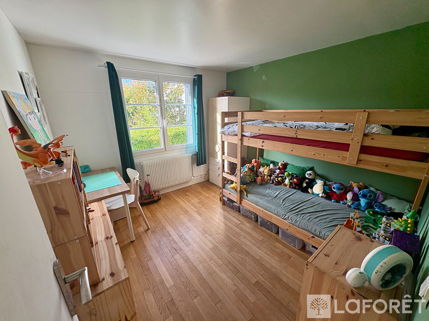 Elle comprend une entrée, une pièce à vivre de 46 m² de plain pied sur le jardin, une buanderie, une cave, wc ; à l'étage : 4 chambres, une salle de bains avec wc et un grenier. Terrain arboré de 750 m² sans aucun vis à vis, avec un abris de jardin, terrasse et 2 stationnements privatifs.