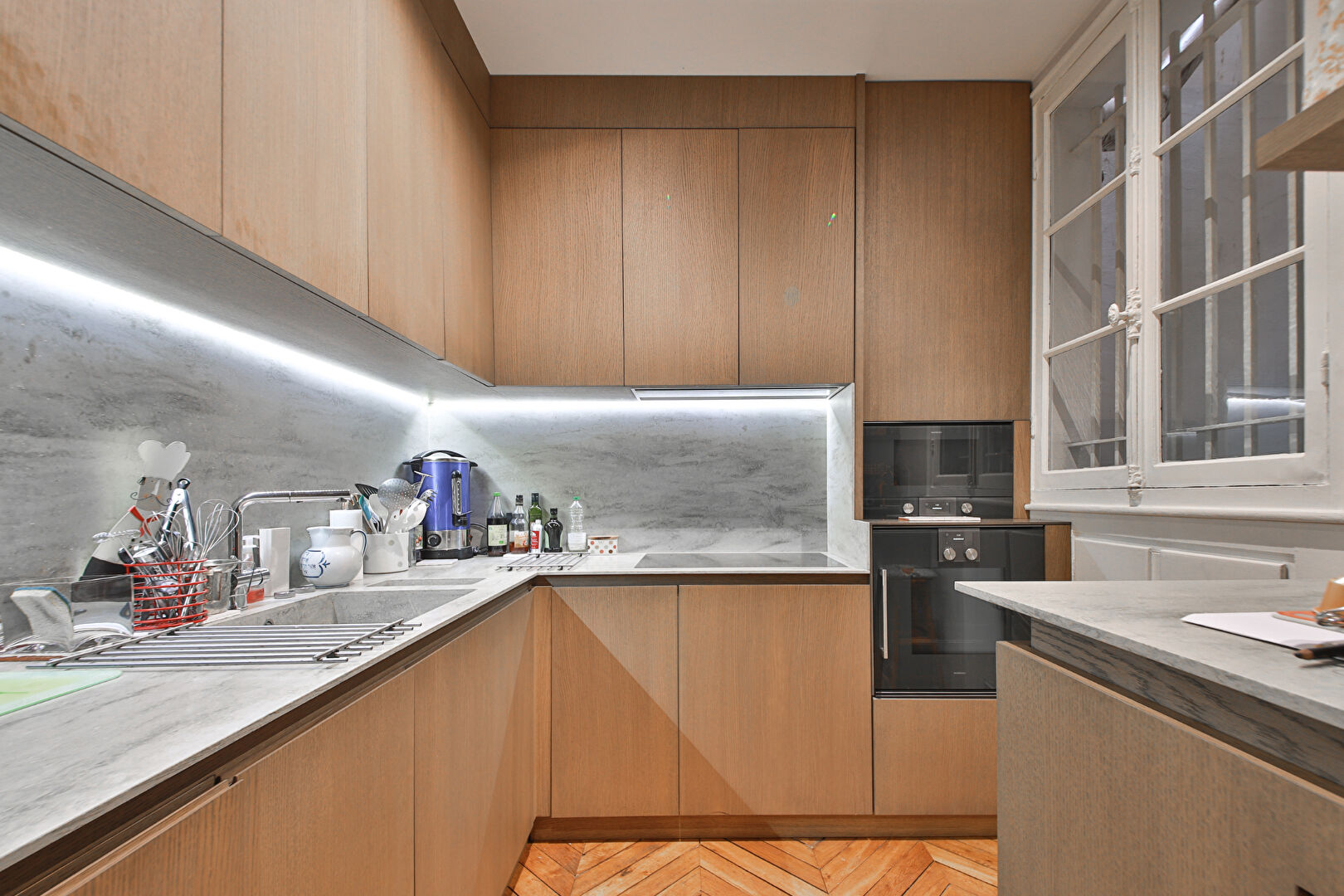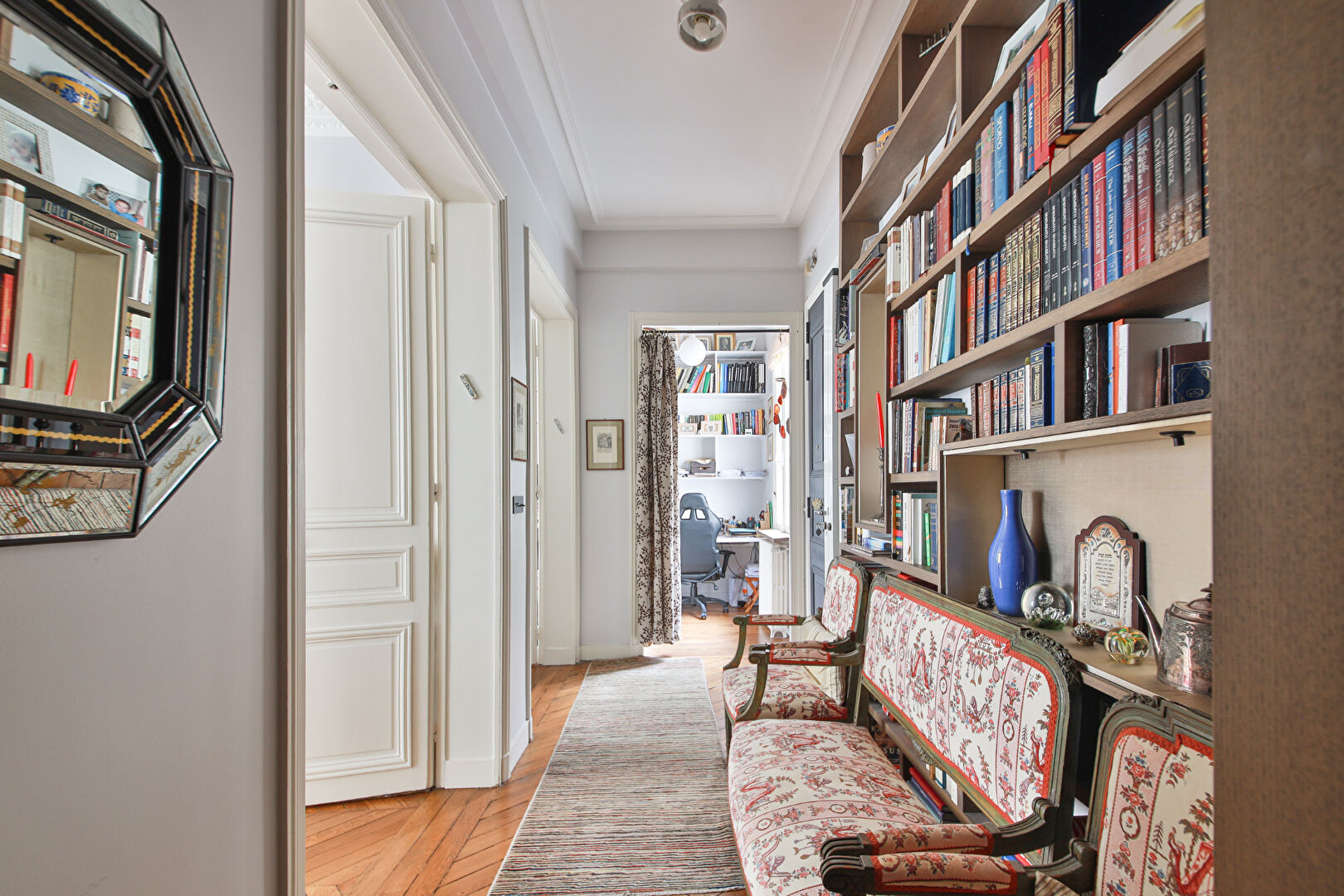 Il comprend un séjour lumineux, une cuisine contemporaine entièrement équipée, trois chambres , un bureau, une buanderie, ainsi que deux salles de bains avec WC. L'appartement a conservé le charme de l'ancien par son beau parquet, ses moulures, ses cheminées et sa hauteur sous plafond .