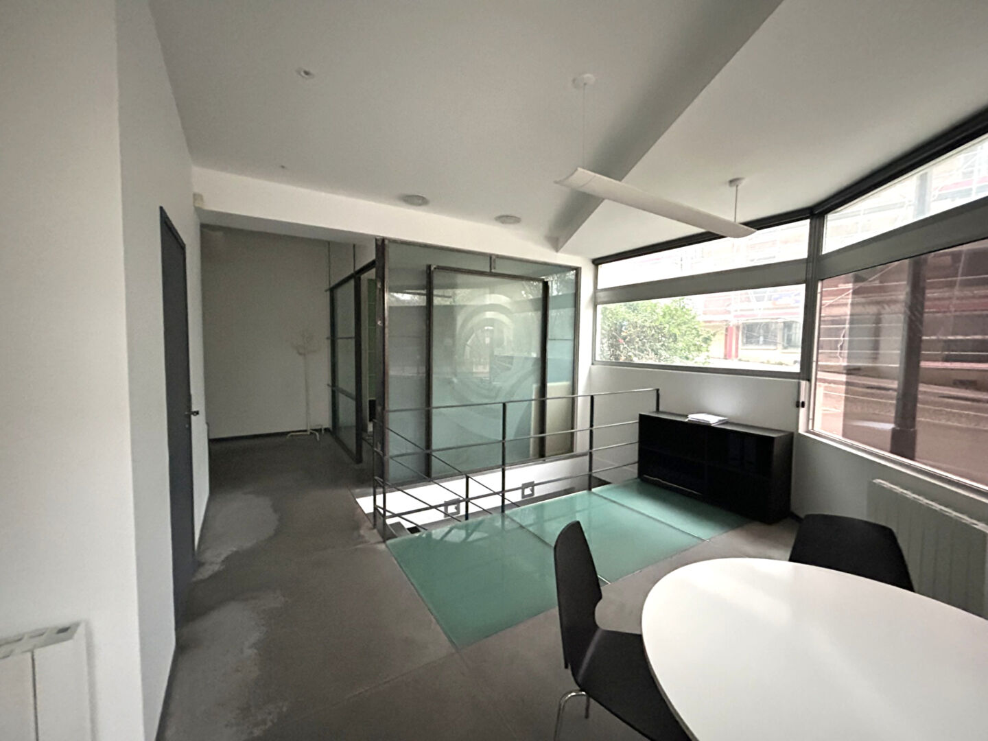 Un mobilier disponible comprend de nombreux placards de rangement, 6 mobiliers de bureaux moderne, une petite table circulaire avec 4 chaises et une table de réunion rectangulaire laquée blanc à piètements inox d'environ 2m x 1m.