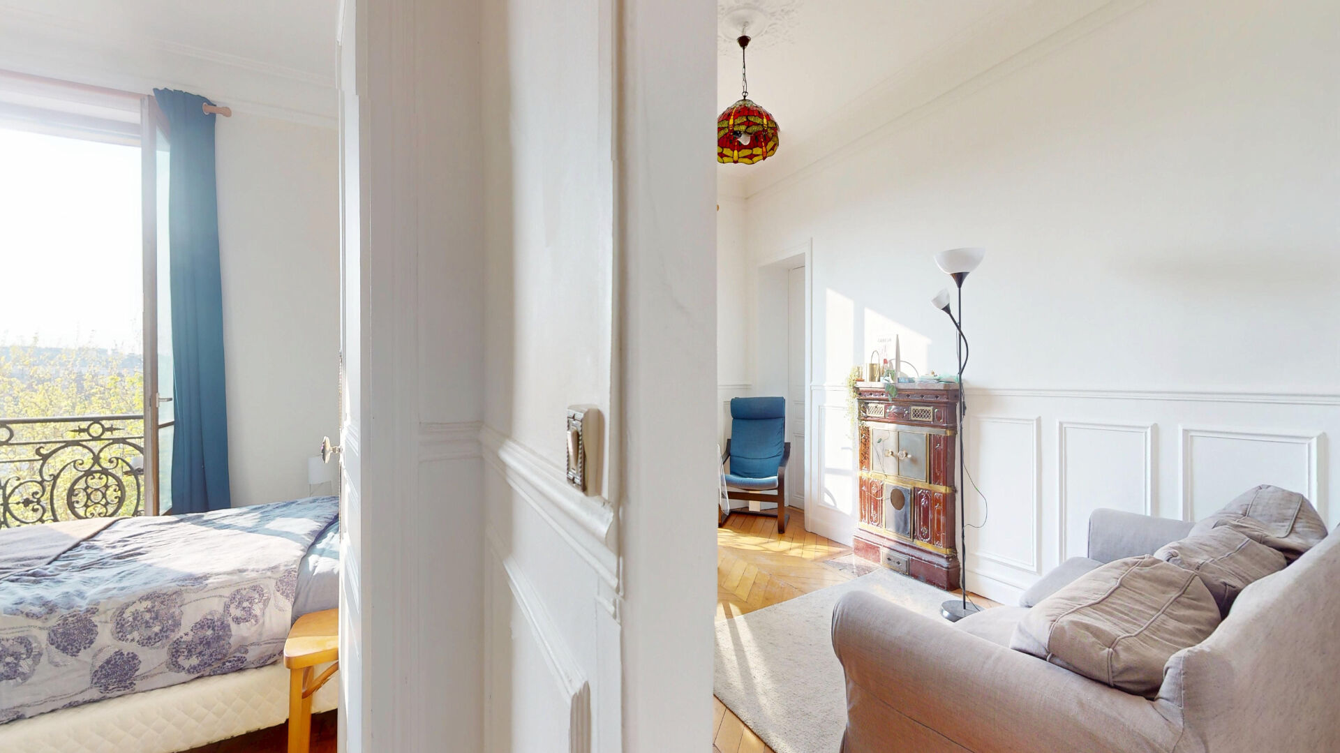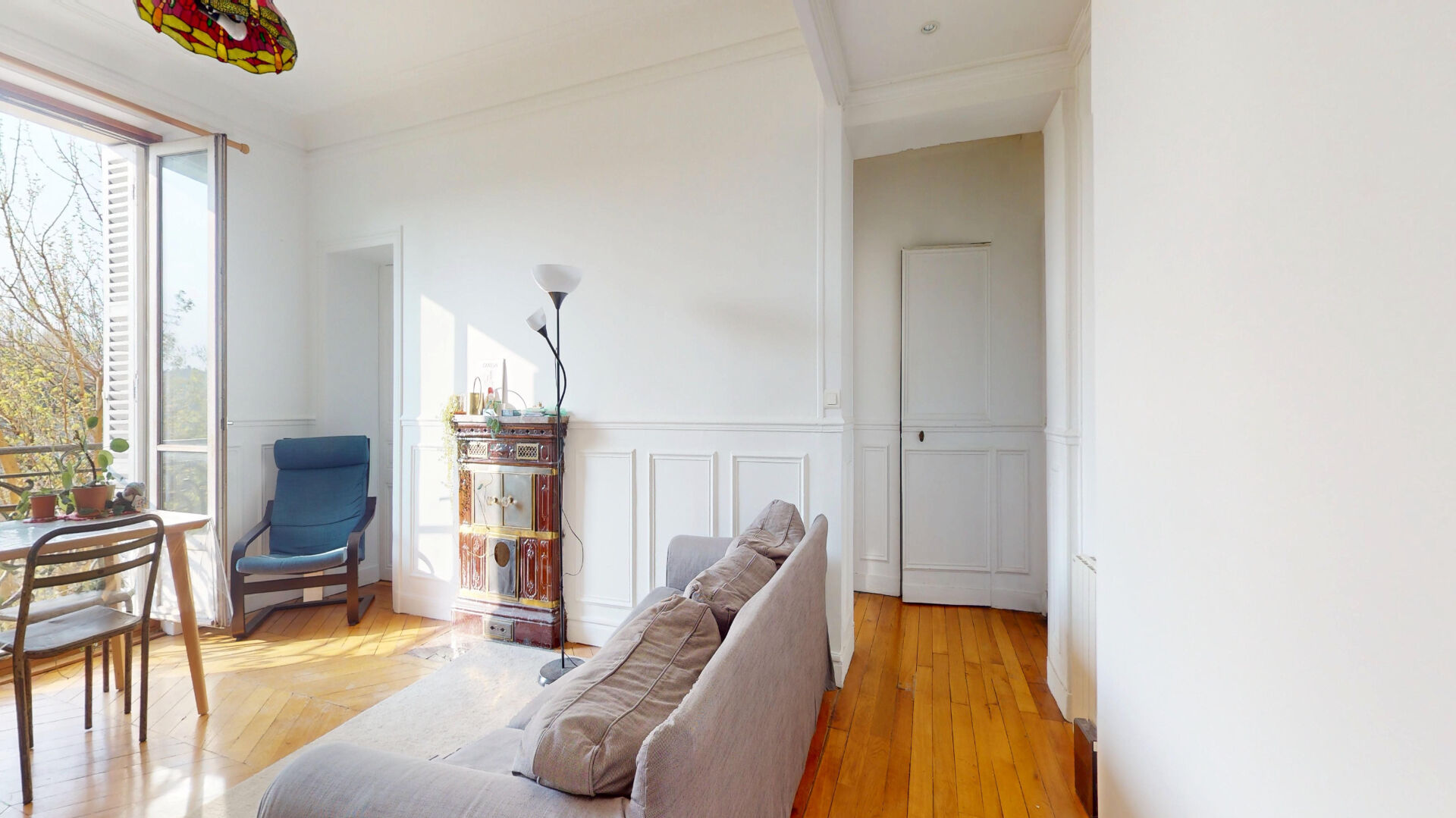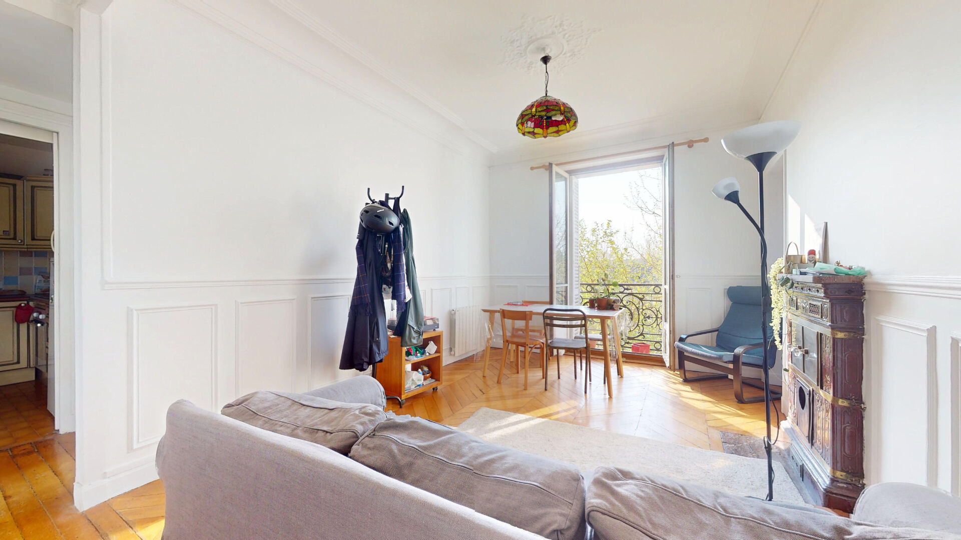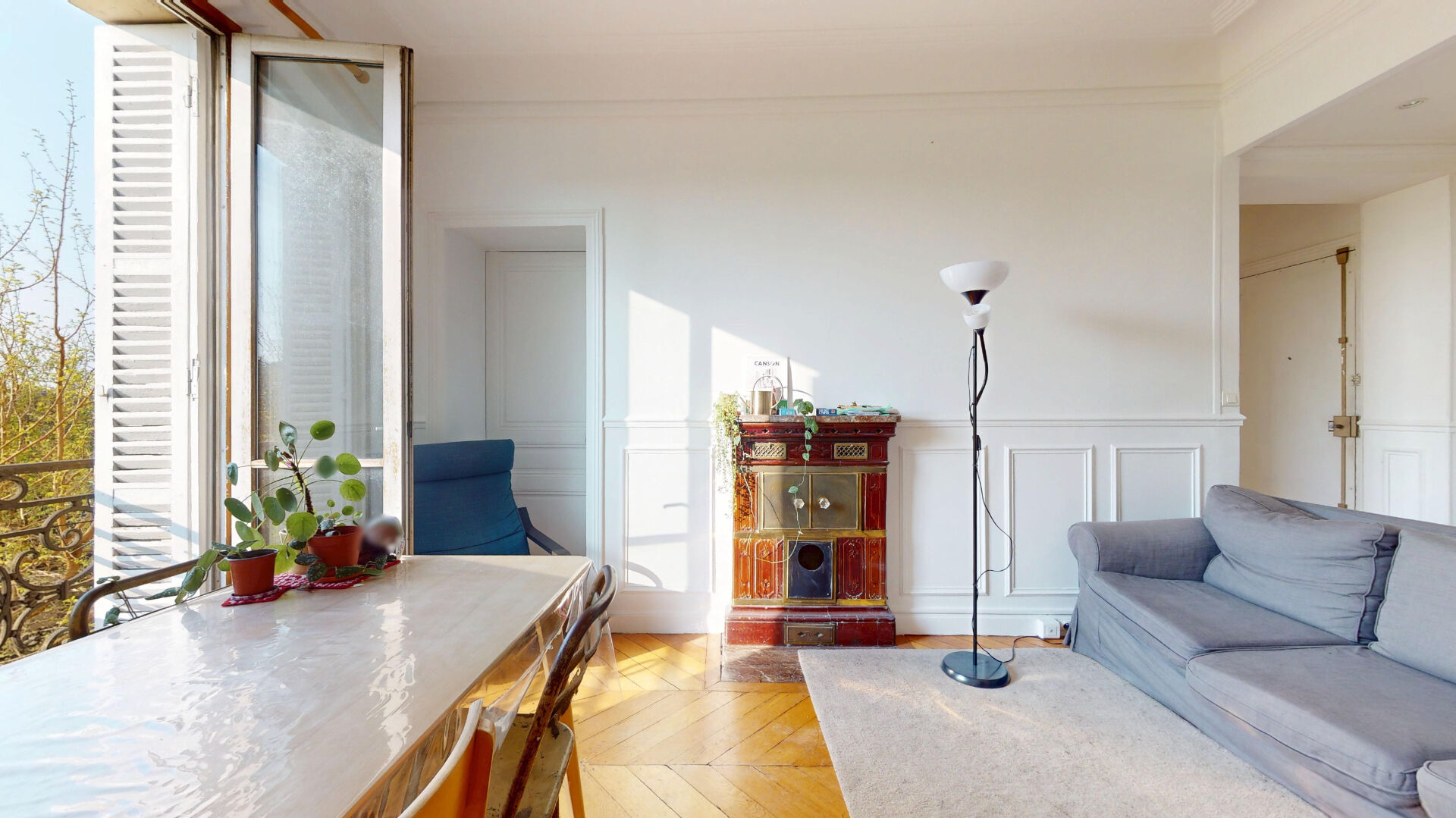 Charme de l'ancien : parquet point de Hongrie, moulures, cheminée et poêle prussien.
