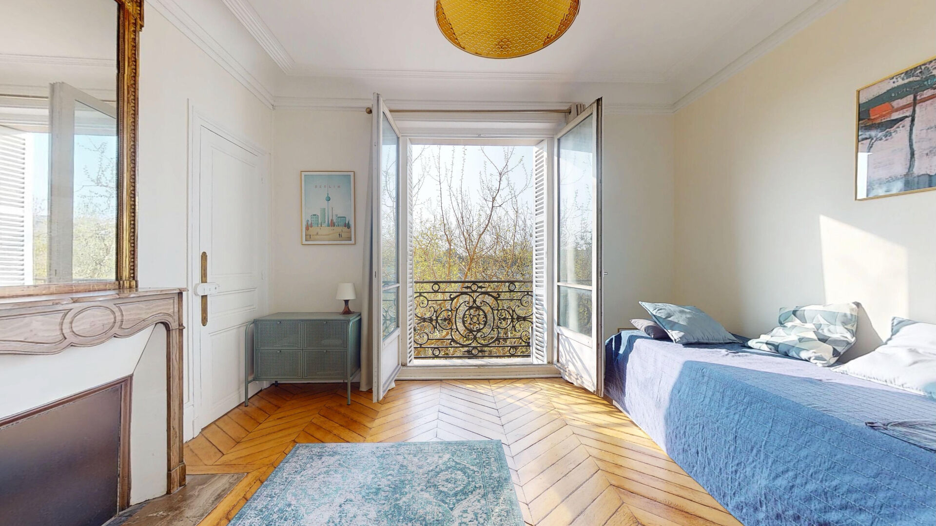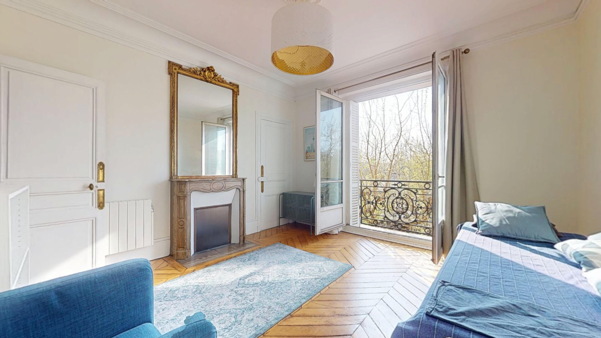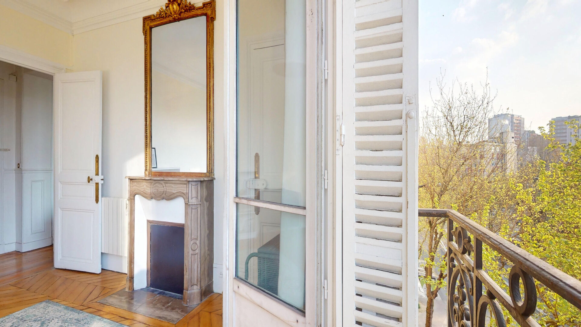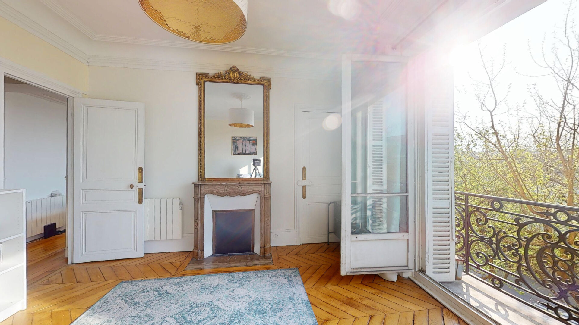 Charme de l'ancien : parquet point de Hongrie, moulures, cheminée et poêle prussien.
