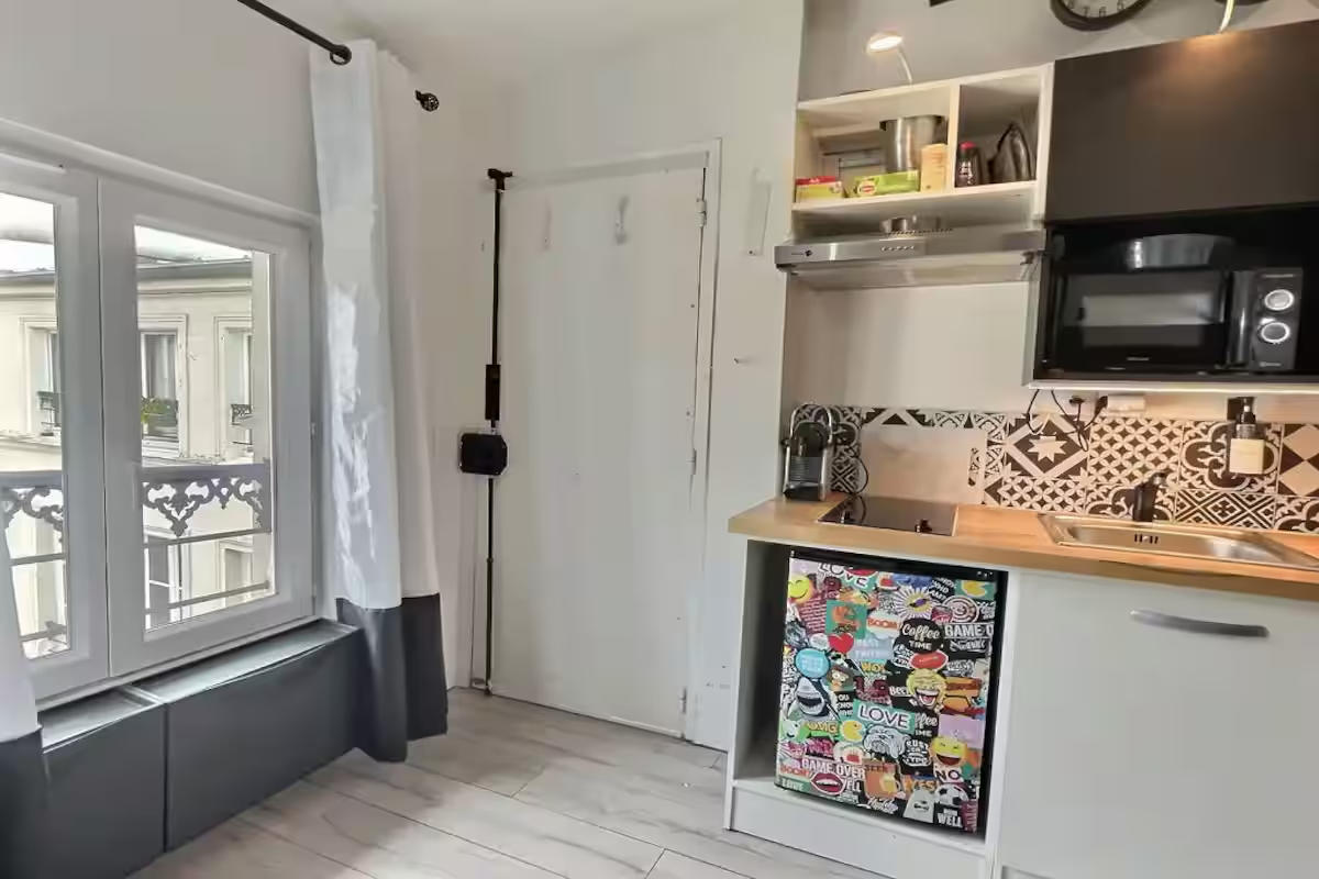 Vous y trouverez une pièce de vie lumineuse bénéficiant d'une vue dégagée avec cuisine aménagée et équipée (expo EST), une salle d'eau avec w-c. Le tout en parfait état. Idéalement situé dans le quartier dynamique et très recherché de la rue du Faubourg st Denis avec tous ses commerces et transports de proximité. Local vélos. Charges de copropriété 336 €/an (soit 28 €/mois) - DPE C