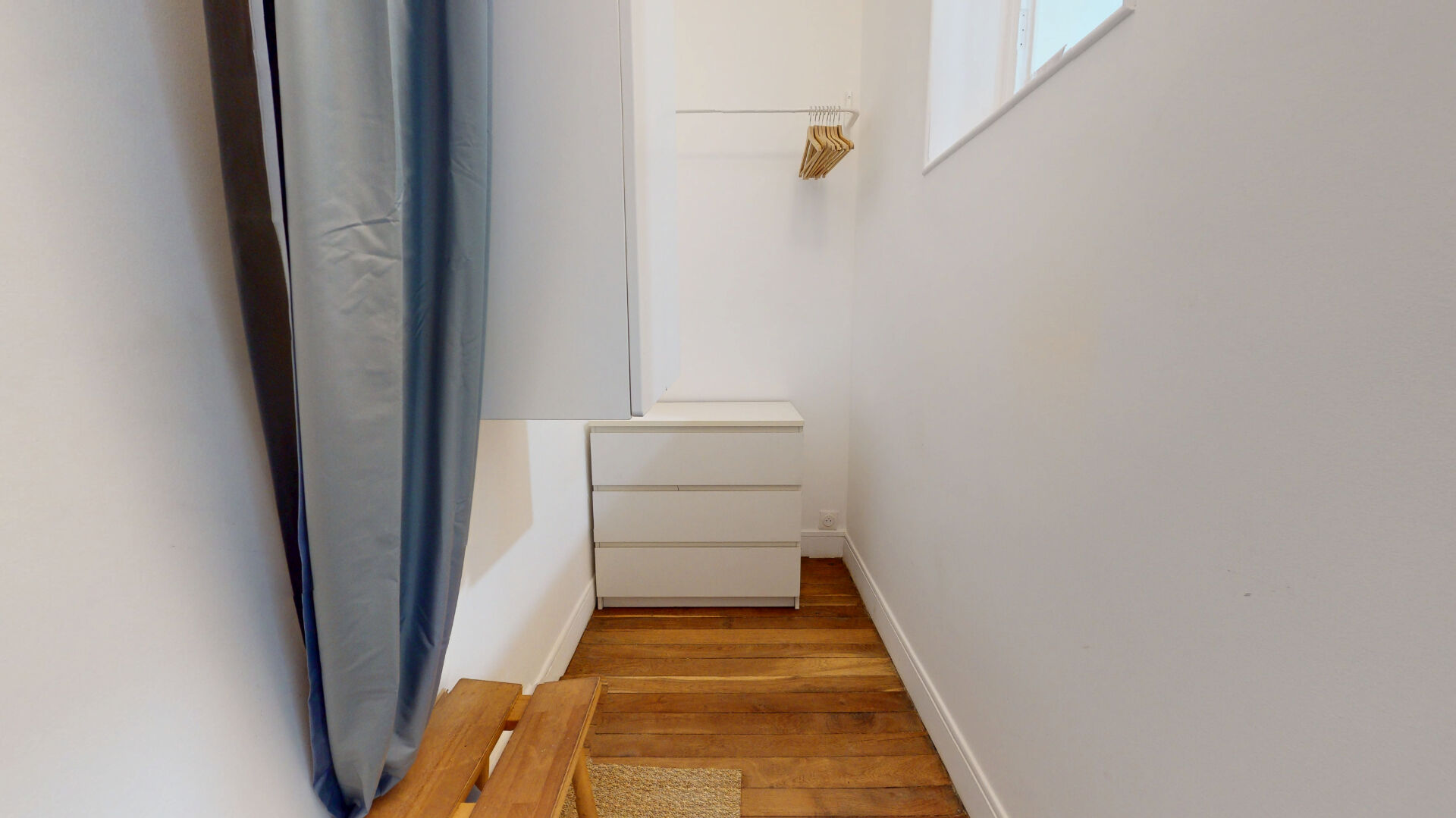 Pièce principale avec parquet ancien, cuisine équipé avec lave-vaisselle, coin nuit avec lit coffre, salle d'eau avec WC, et un espace de rangement/dressing.