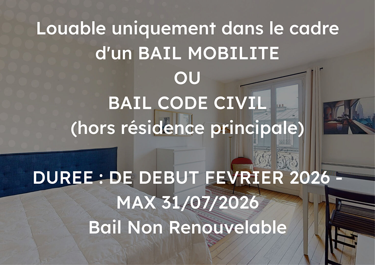 BAIL UNIQUEMENT EN CODE CIVIL (RESIDENCE SECONDAIRE) OU BAIL MOBILITE - FIN DU BAIL A MAX 31/07/2026 - NON RENOUVELABLE