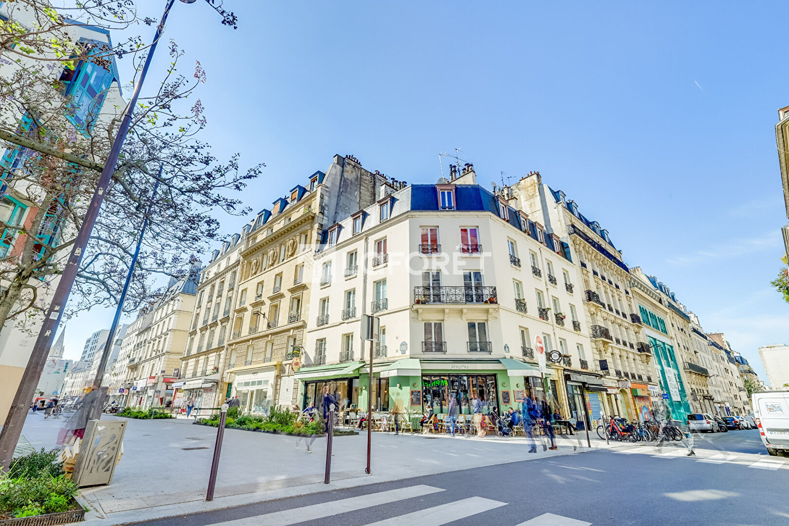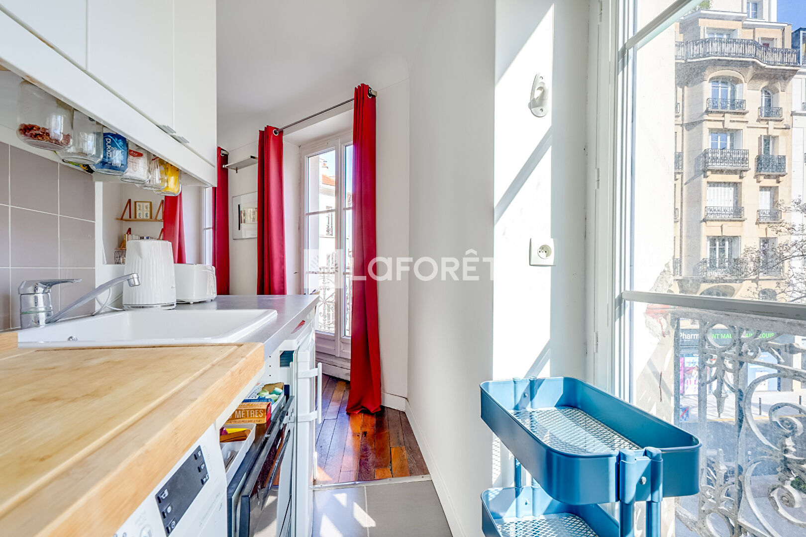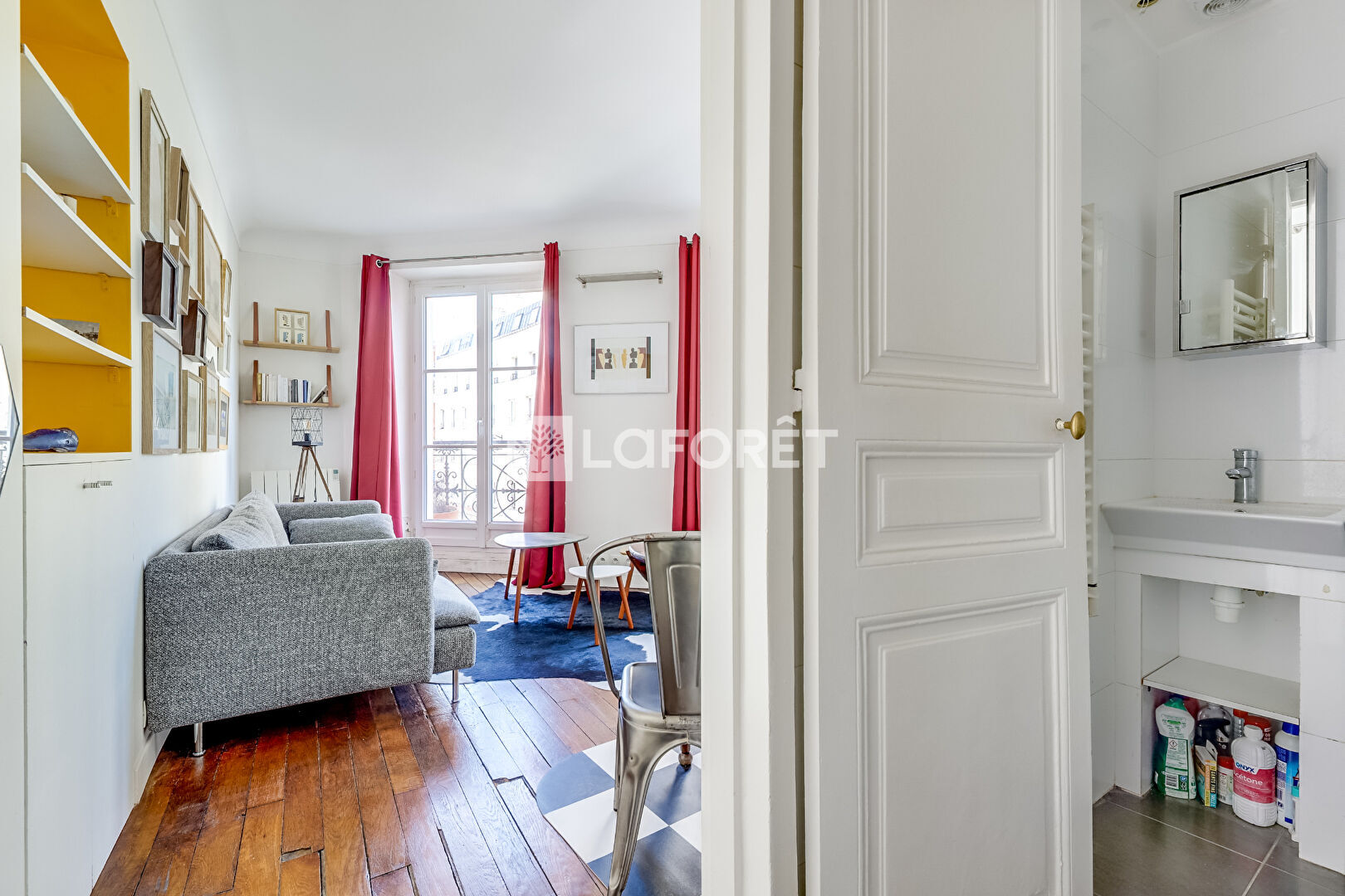2 pièces très lumineux grâce à ses trois fenêtres dans le séjour et sa vue d'angle sur la place du Buisson St Louis.
