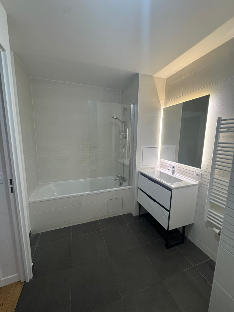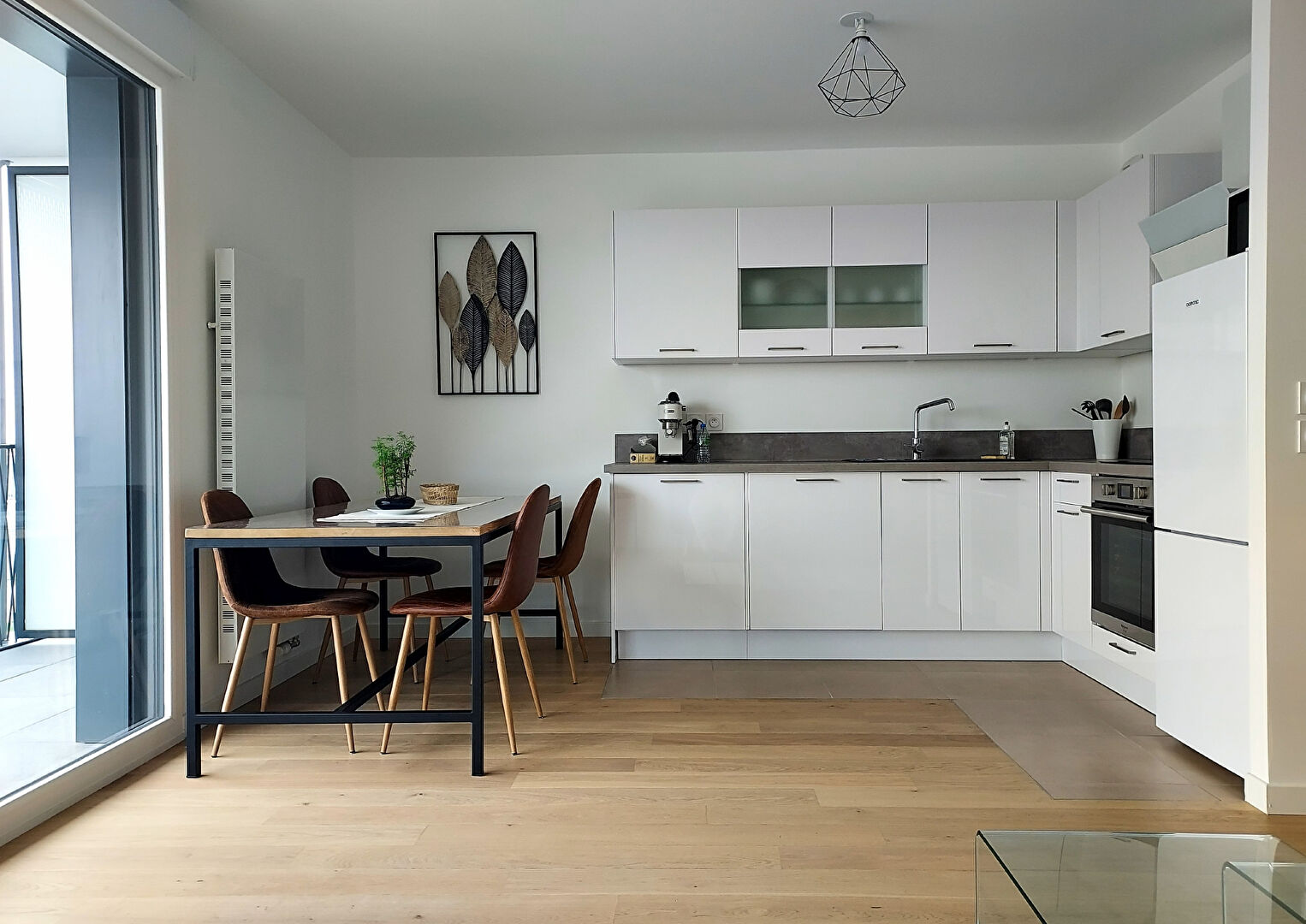 A 16 min de la Défense, appartement T3 REFAIT A NEUF MEUBLE 61m2, étage 6/7 (ascenseur), exposition Sud-Ouest, lumineux, meublé, comprenant entrée , Séjour avec cuisine ouverte aménagée et équipée (lave-linge séchant, lave-vaisselle, four, réfrigérateur...) GRAND BALCON avec vue dégagée et Tour Eiffel, 2 chambres au calme sur cour, salle de bains avec WC.