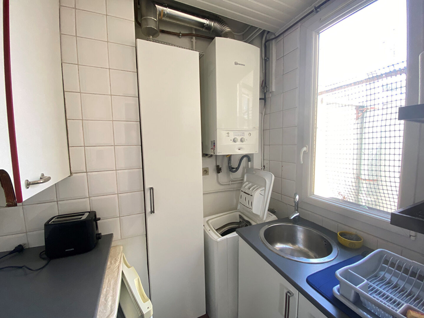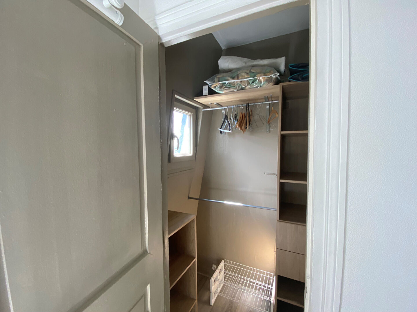 L'appartement est composé d'une pièce principale avec cagibi, une cuisine aménagée et équipée, une chambre avec rangements et dressing, salle d'eau avec WC.