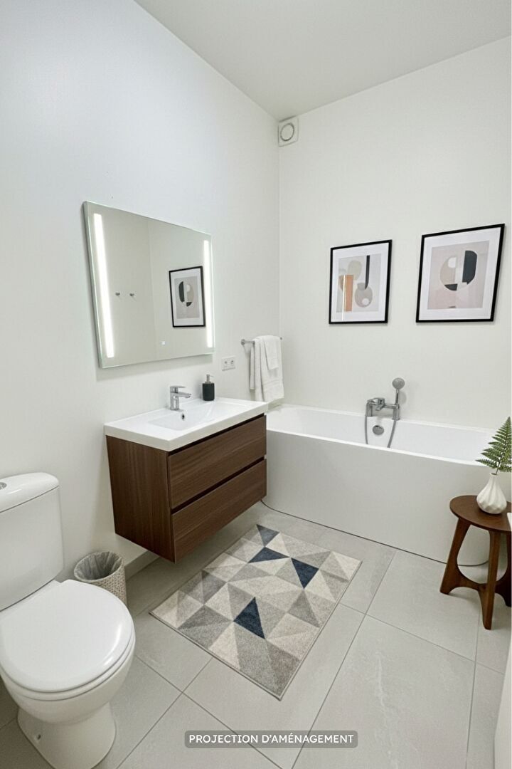 La visite se poursuit avec une salle de bains avec toilettes, fonctionnelle et facilement optimisable.