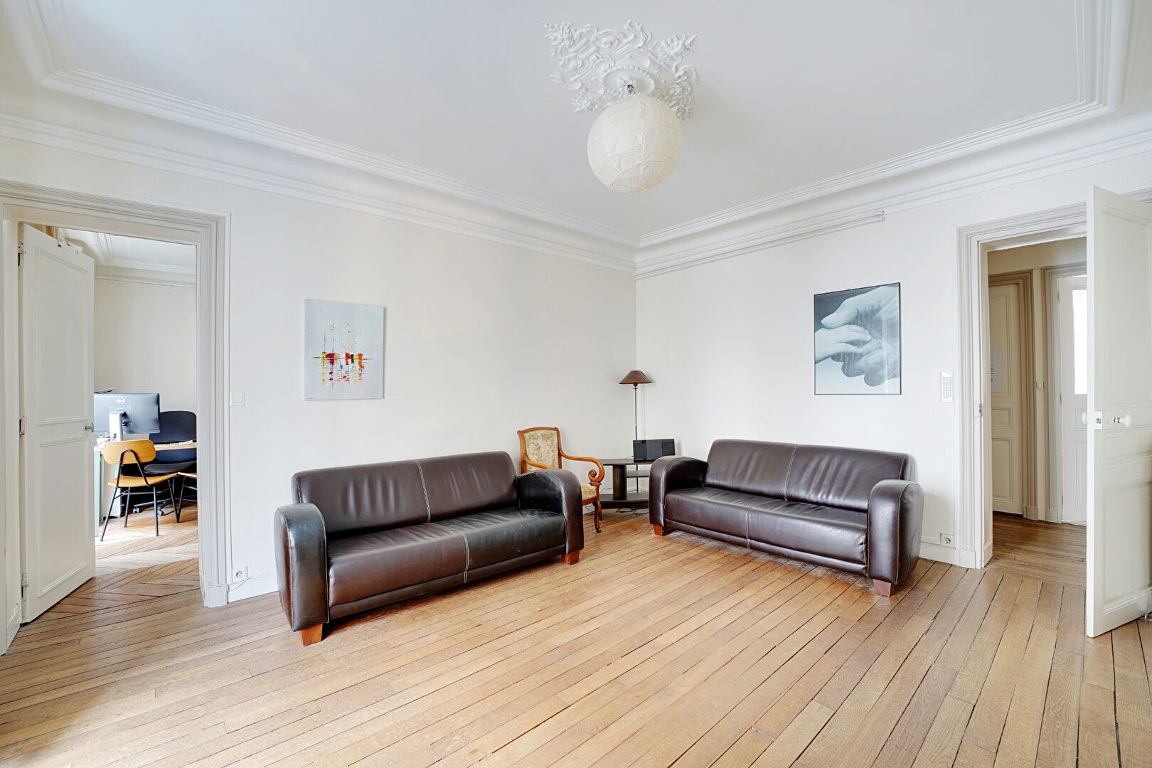 Composé d'une entrée 4.56m², wc séparés, cuisine indépendante 7.80m², un bureau de 13.88 m² sur cour arborée orienté Sud, une salle de bains, une pièces de réception de 18.30 m² pouvant s'ouvrir sur une pièce de 16,24 m² et une une quatrième pièce de 16.43 m².