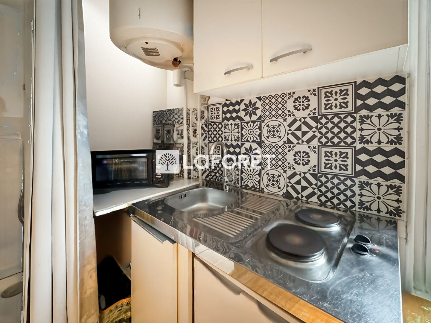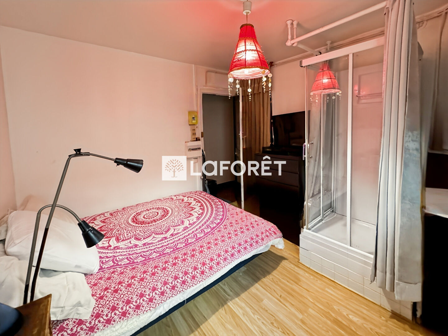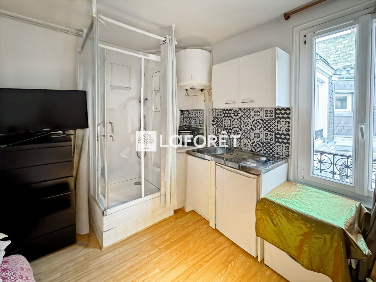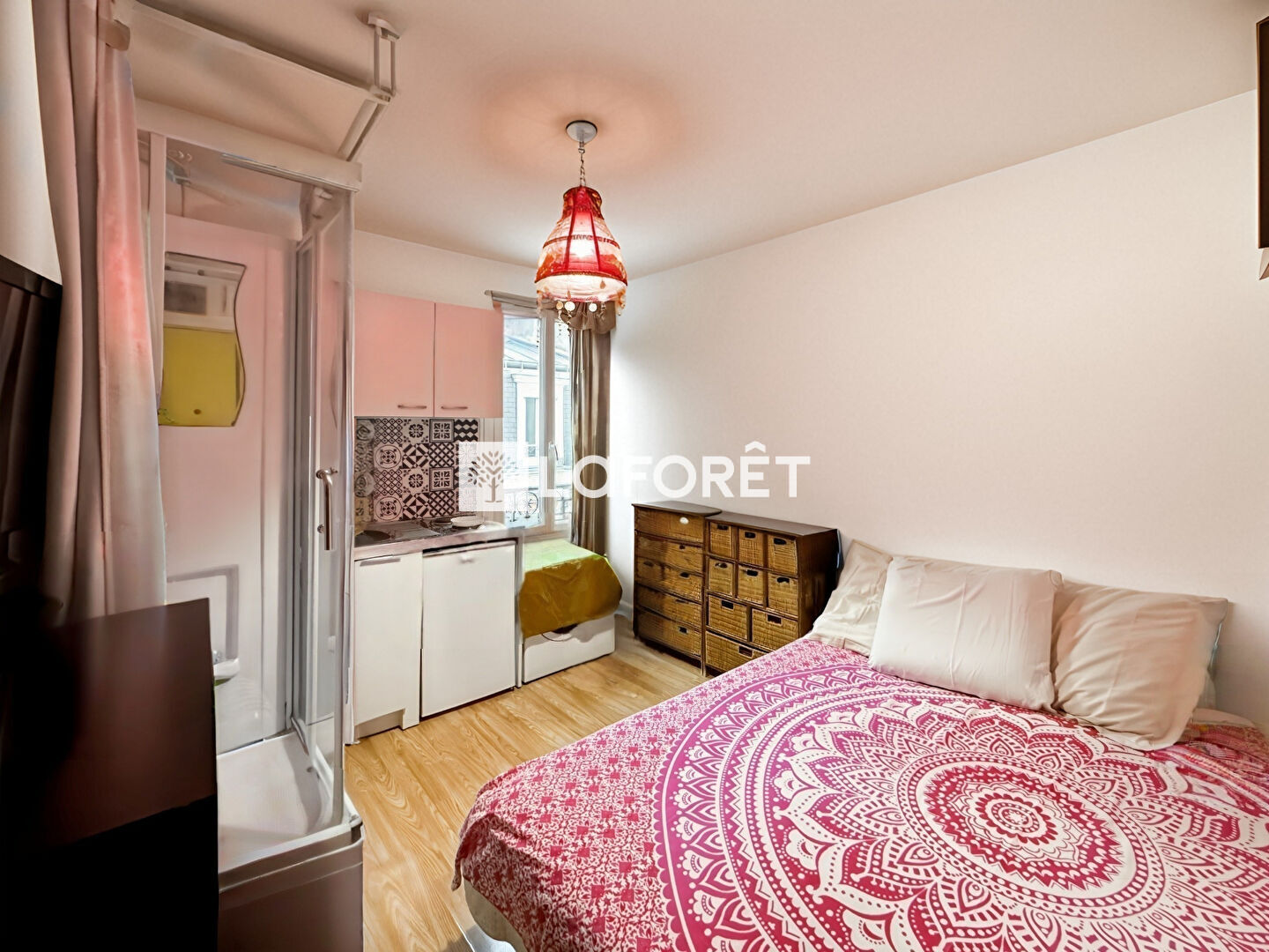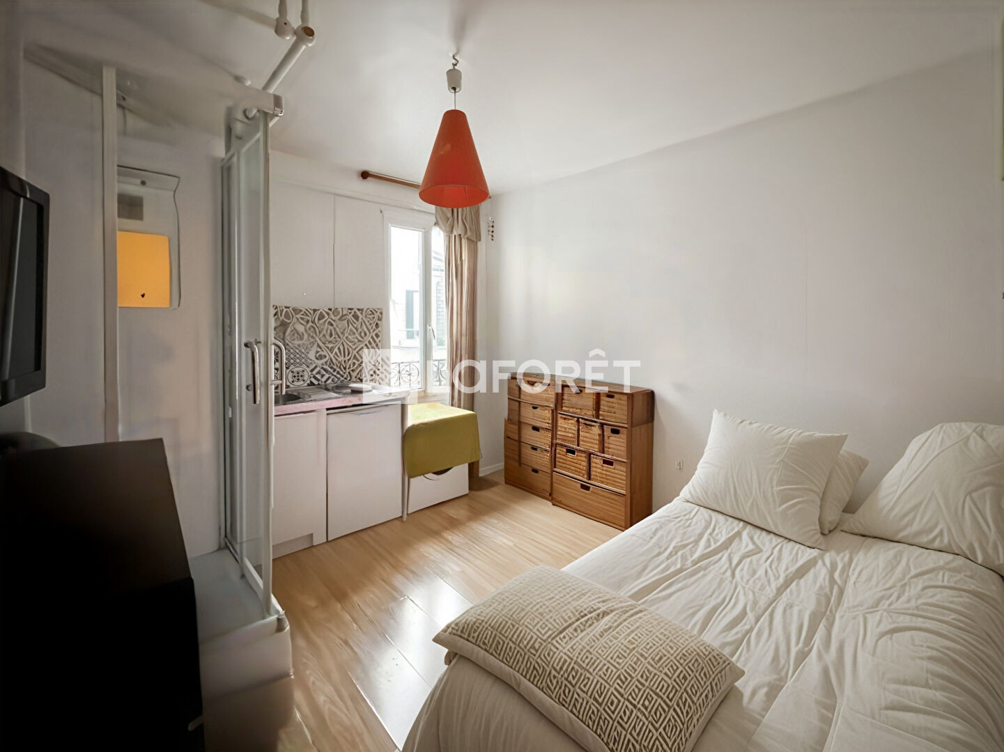 Au calme absolu, donnant uniquement sur cour. elle comprend une kitchenette, une douche, et offre suffisamment d'espace pour y installer un canapé-lit et un bureau.