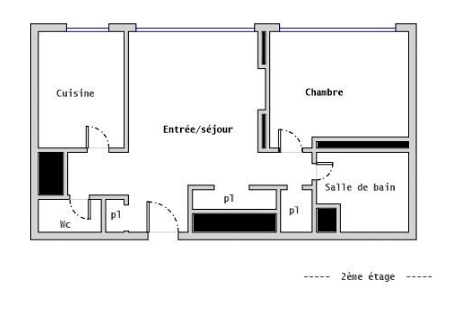 L'agencement actuel comprend une entrée, un séjour, une chambre, une cuisine indépendante (possibilité d'ouverture sur le séjour), une salle de bains et des WC séparés.
