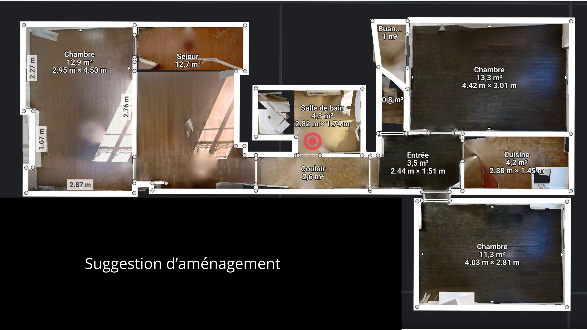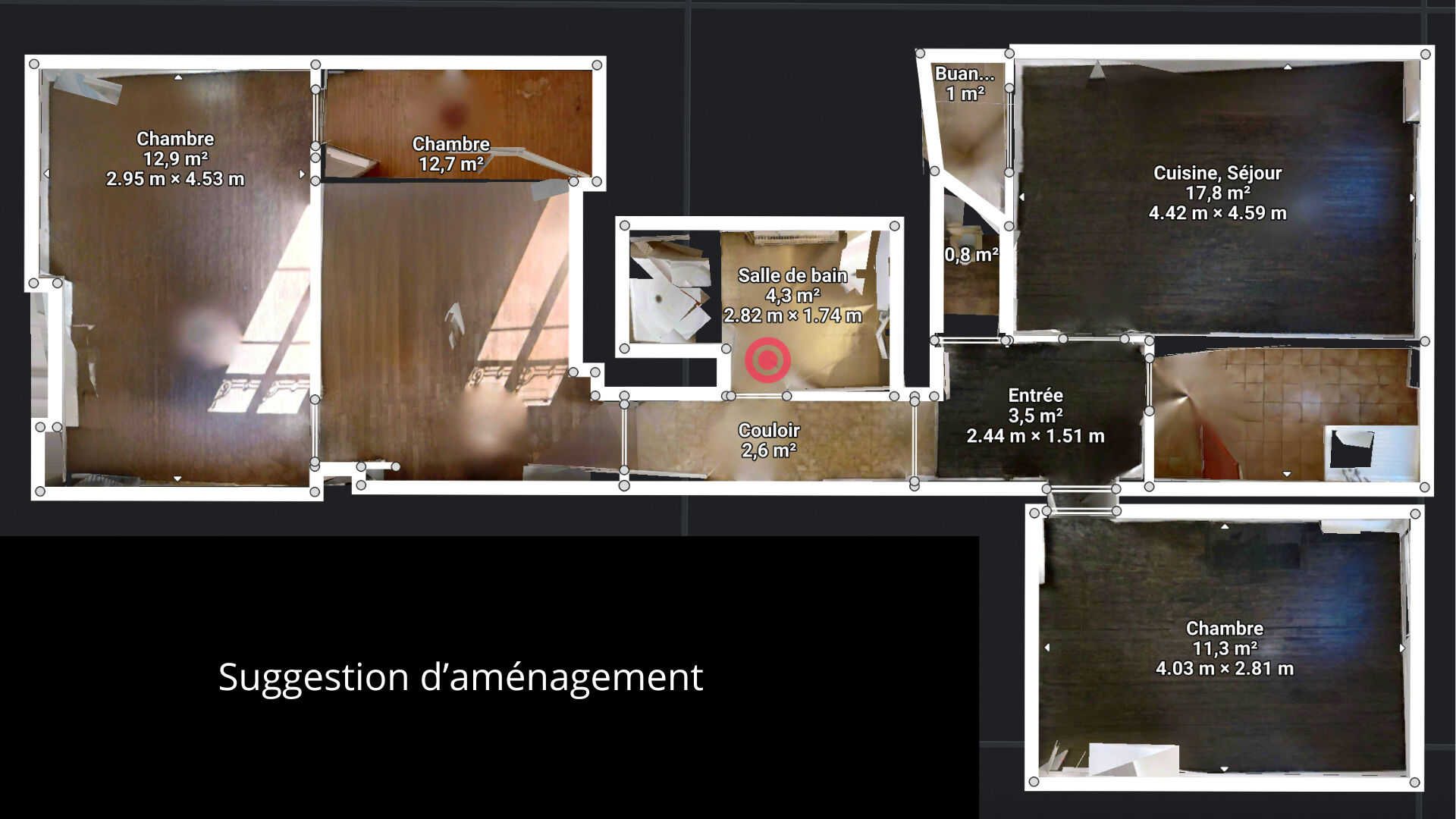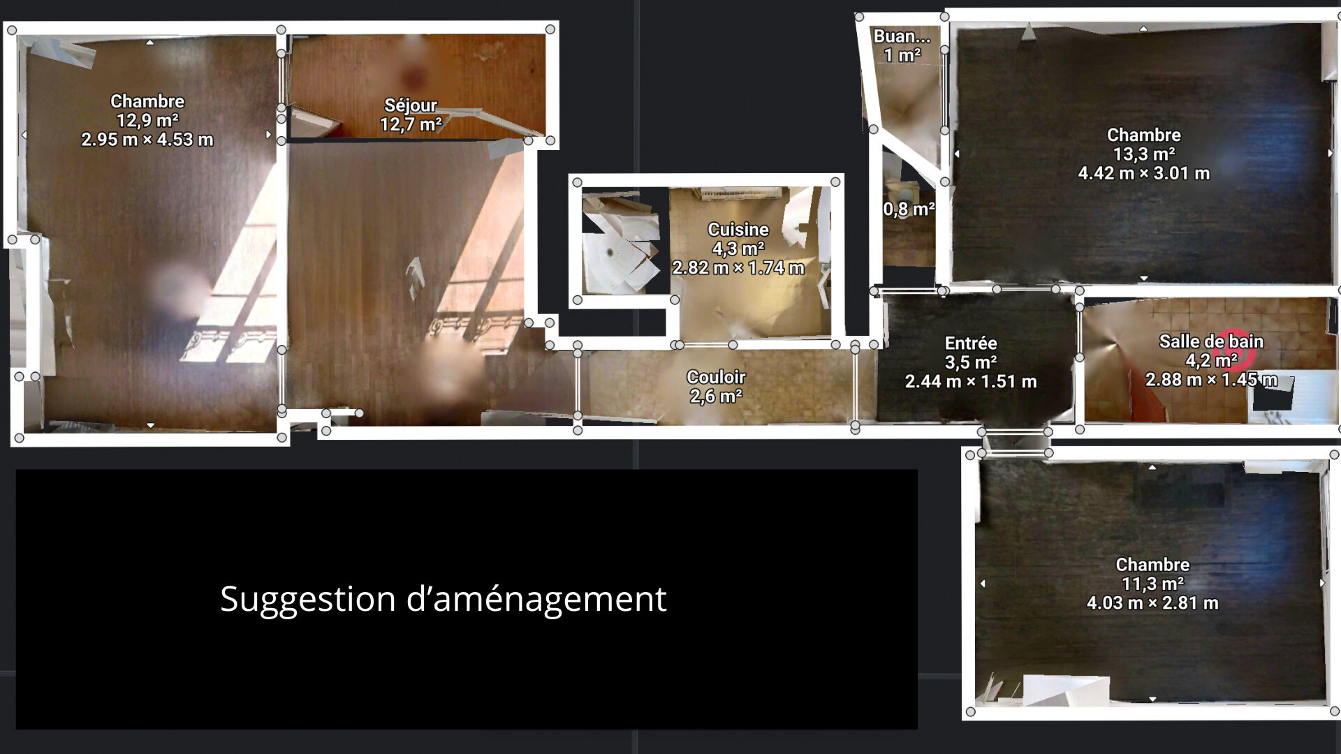 Il se compose actuellement d'un séjour, de 3 chambres, d'une cuisine indépendante et d'une salle d'eau. Son plan modulable vous permettra d'aménager l'espace selon vos envies et vos besoins (voir exemple plan dernières photos) .
