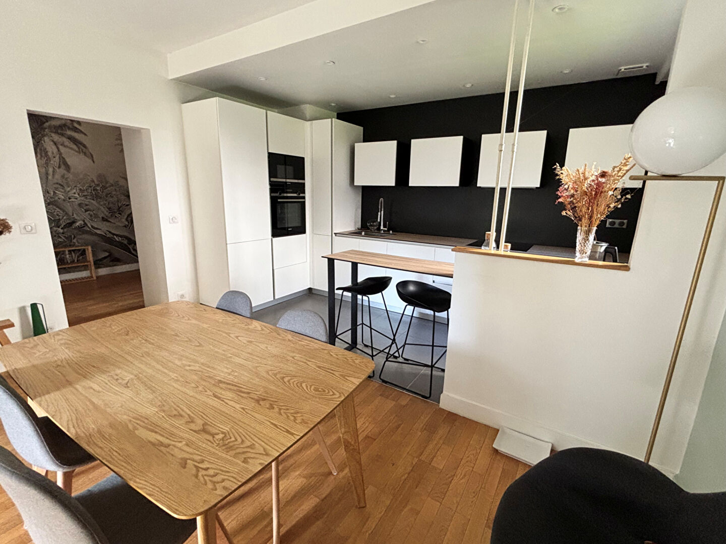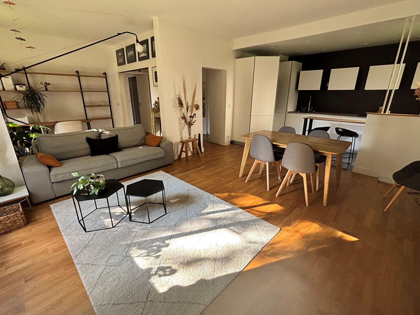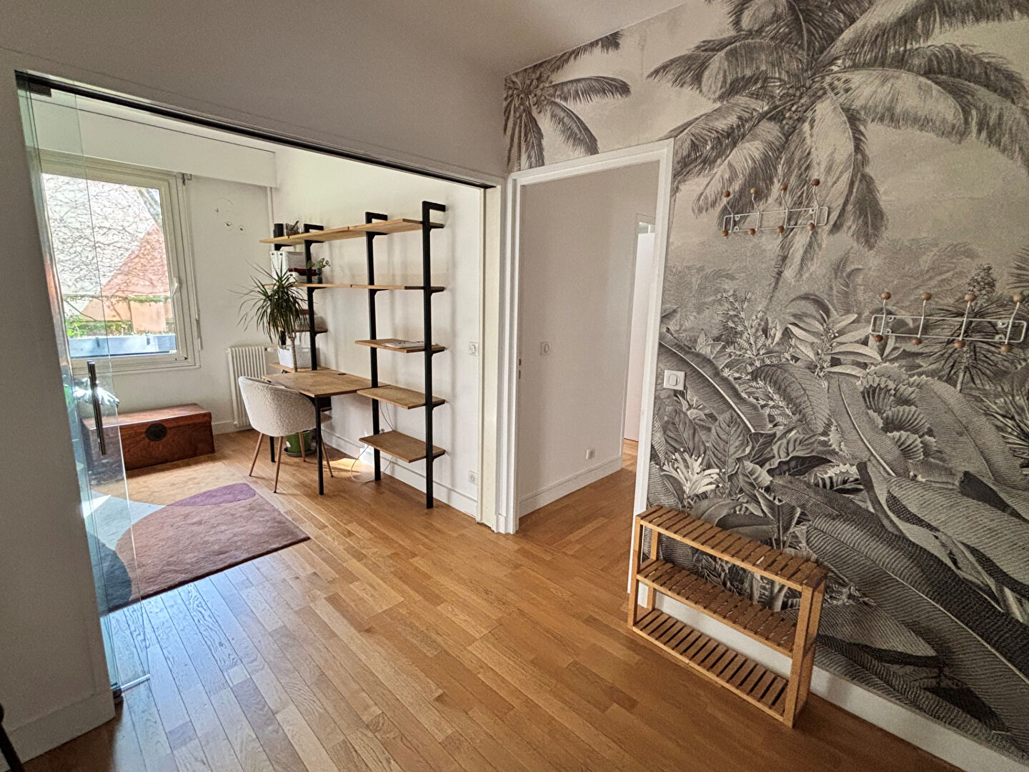 L'appartement est sans vis à vis, il se compose d'une entrée avec placard, une cuisine ouverte sur un salon-salle à manger, trois chambres dont une avec placard, deux dégagements, un wc séparé, une salle de bains et une salle d'eau.