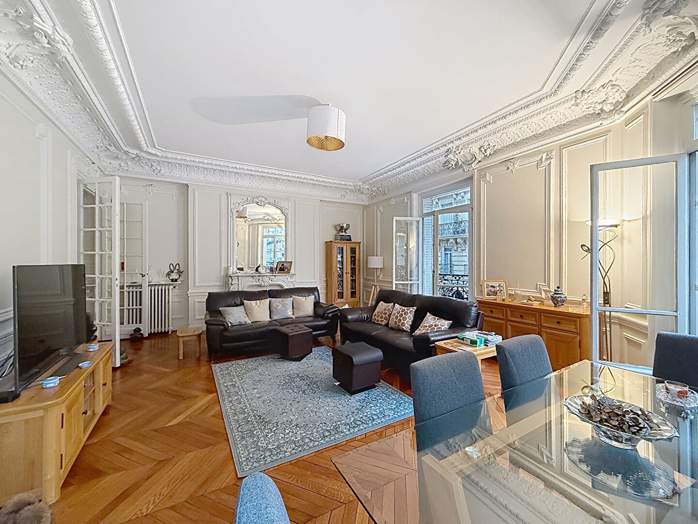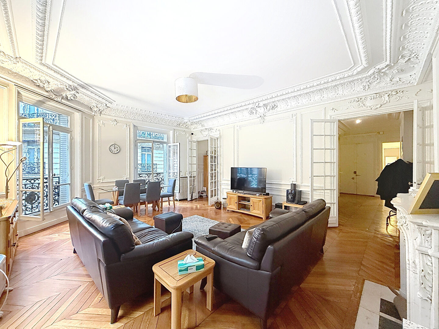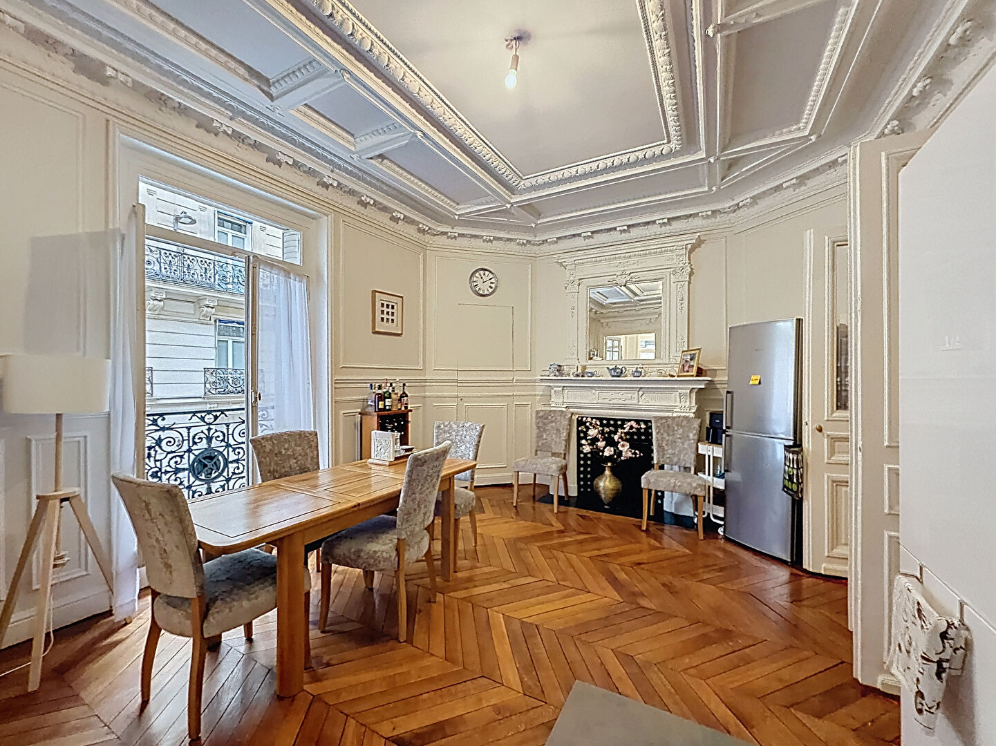 D'une superficie totale de 147.68m² , il comprend: une entrée spacieuse, une salle à manger avec cuisine ouverte et équipée d'une plaque de cuisson, d'une hotte, d'un four (espace pour lave vaisselle) d'un salon lumineux, une chambre parentale avec salle de bains attenante comprenant un wc, une seconde chambre avec salle de douche attenante, une troisième chambre, et un WC séparé. Appartement en très bon état général avec parquets, moulures et cheminées.