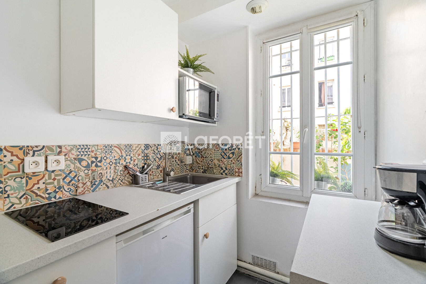 La cuisine, séparée et fonctionnelle, s'ouvre sur un agréable jardin offrant une belle vue verdoyante.