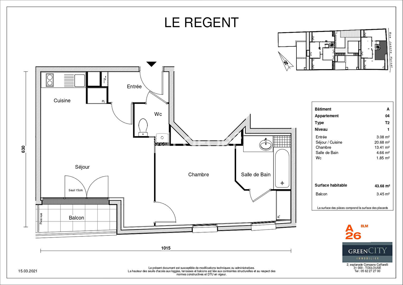 L'appartement offre une entrée avec wc séparé, un séjour lumineux et calme avec grand balcon et cuisine équipée et aménagée, une chambre avec dressing au calme et une salle de bain avec lave linge.