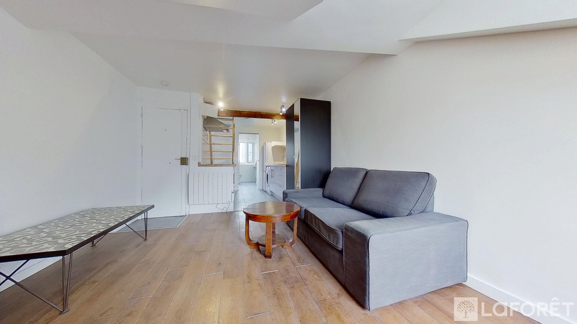 Cet appartement au calme, avec vue dégagée, se compose d'un grand séjour lumineux avec cuisine ouverte, d'une salle d'eau avec WC et d'une chambre à l'étage.