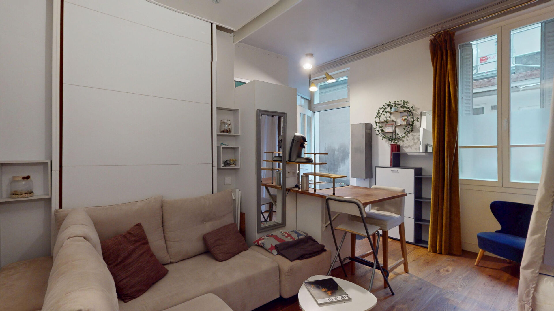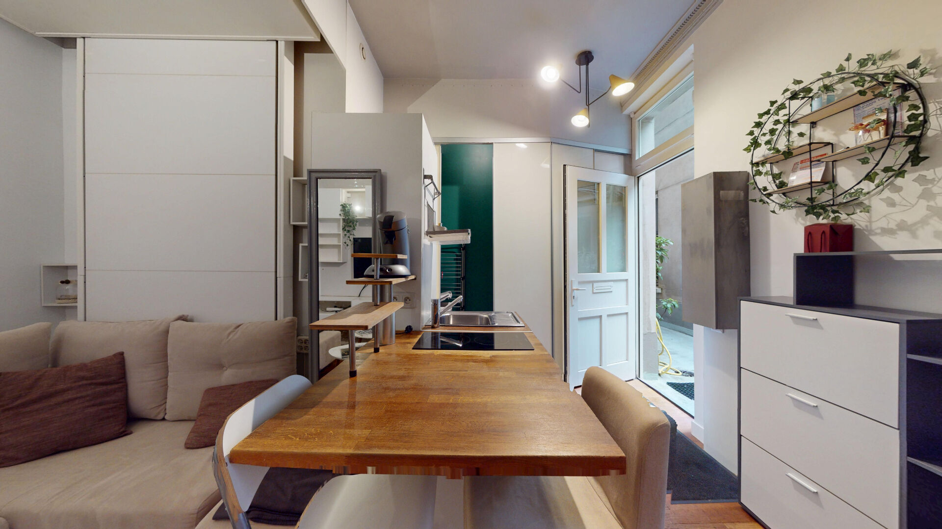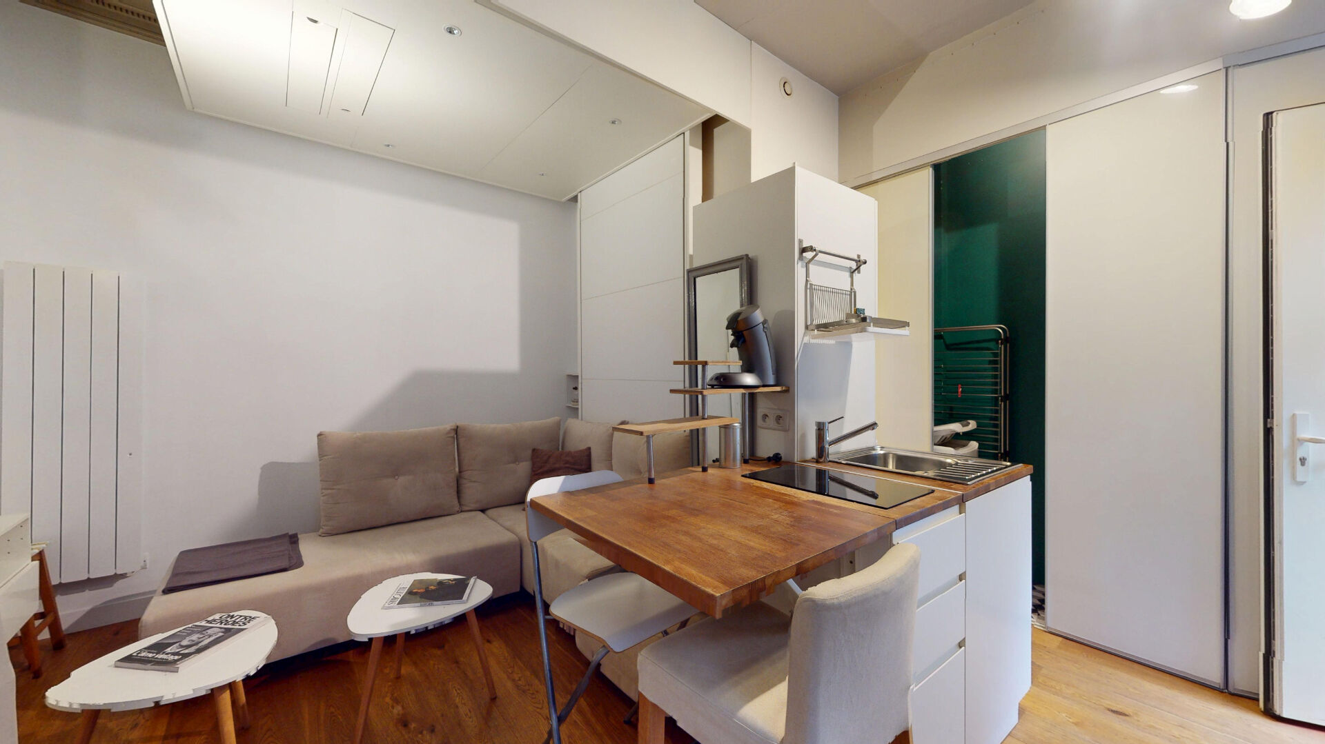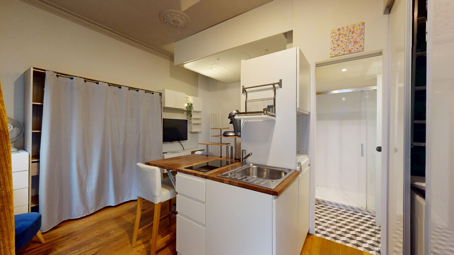 Nous avons le plaisir de vous proposer ce studio de 20.71m² carrez au rez-de-chaussée d'un bel immeuble haussmannien parfaitement entretenu donnant sur une cour fleurie. Il bénéficie d'un agencement optimisé et sans perte d'espace (cf visite virtuelle) : pièce de vie avec cuisine ouverte aménagée et équipée, un lit escamotable BedUp, une salle d'eau et WC séparé avec espace de buanderie et stockage. Bel hauteur sous plafond. Rack à vélos dans la copropriété. Professions libérales autorisées. visite virtuelle : https://my.matterport.com/show/?m=4bFhhs261Rg