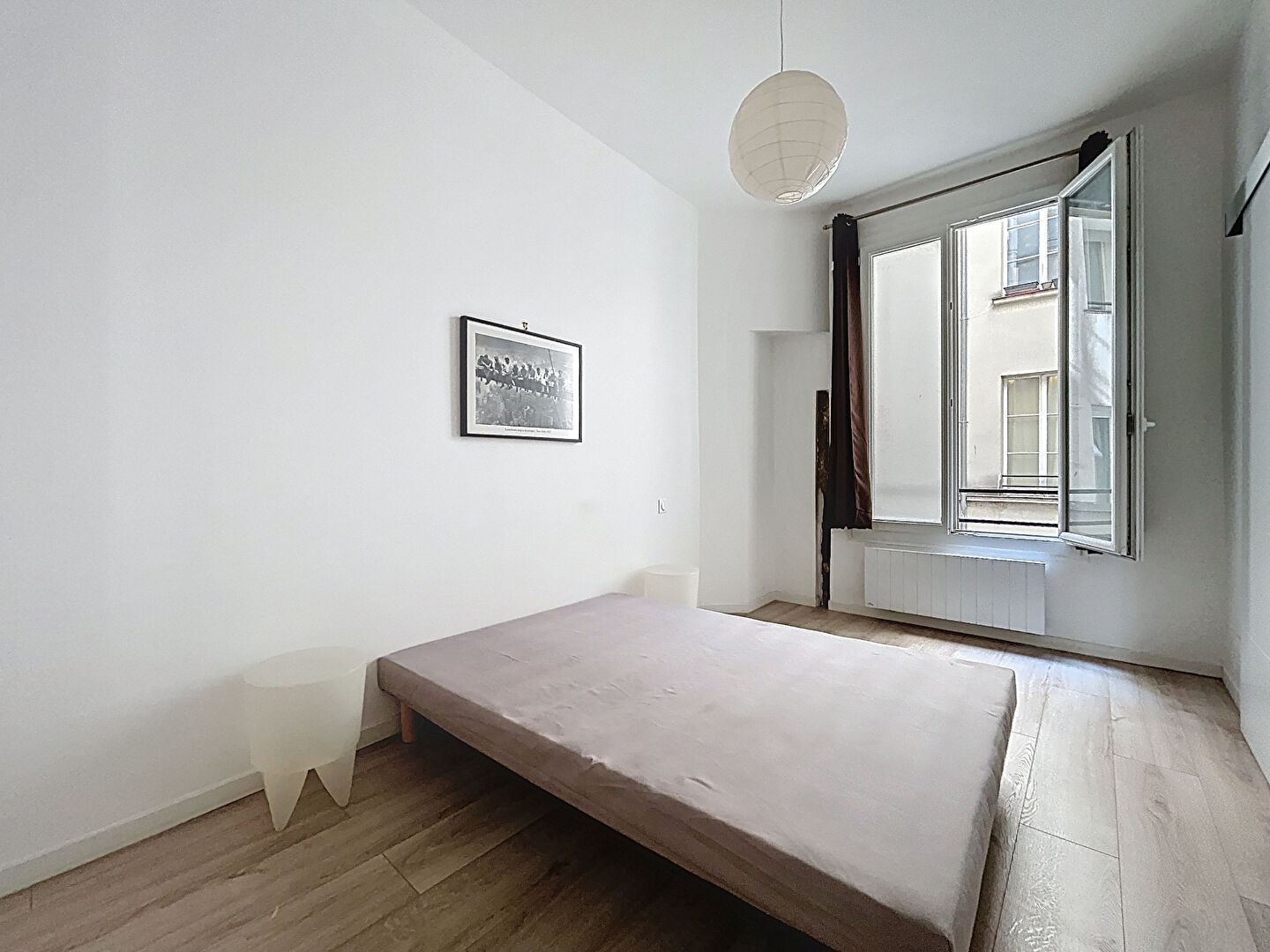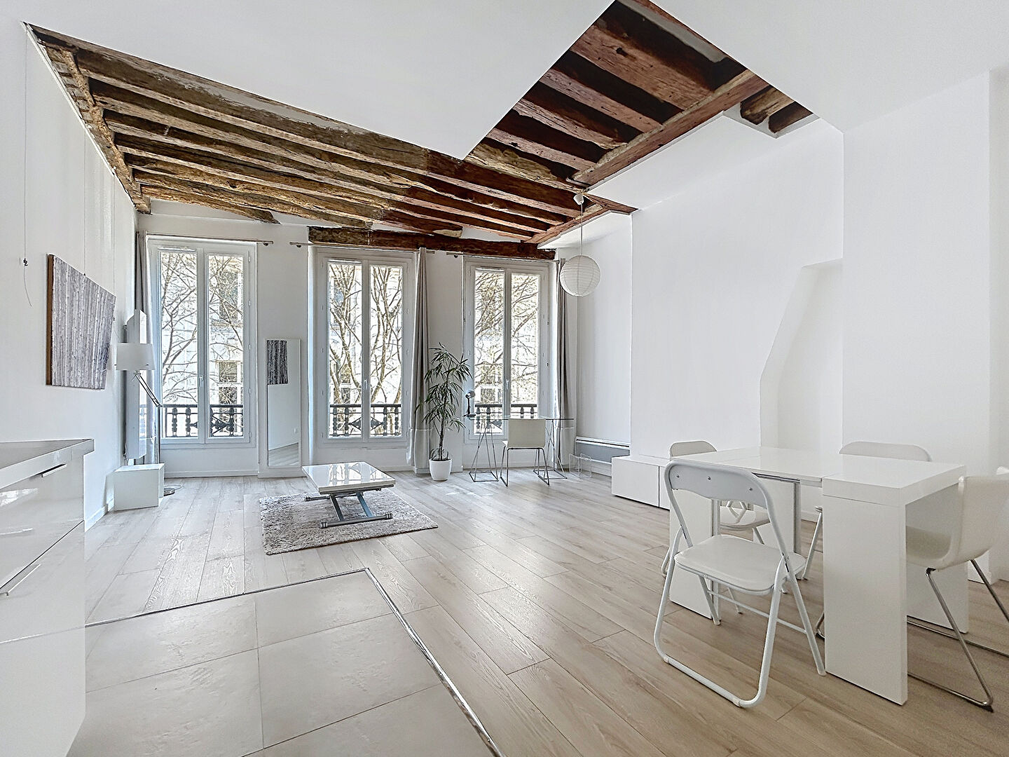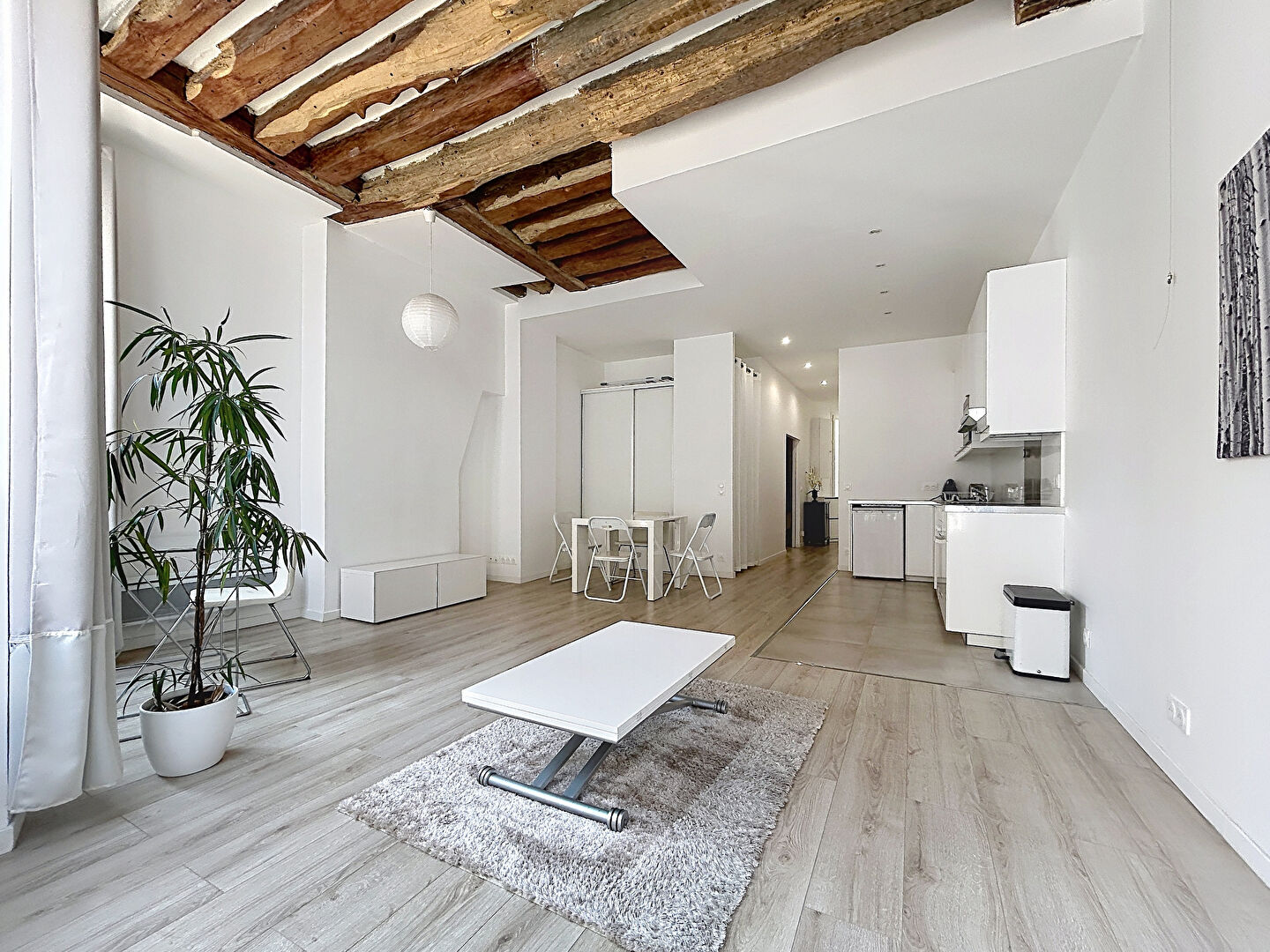Il comprend une entrée, un vaste séjour sur rue arborée, une cuisine ouverte équipée et aménagée, une chambre sur cour avec dressing, une salle de bains et un WC séparé.