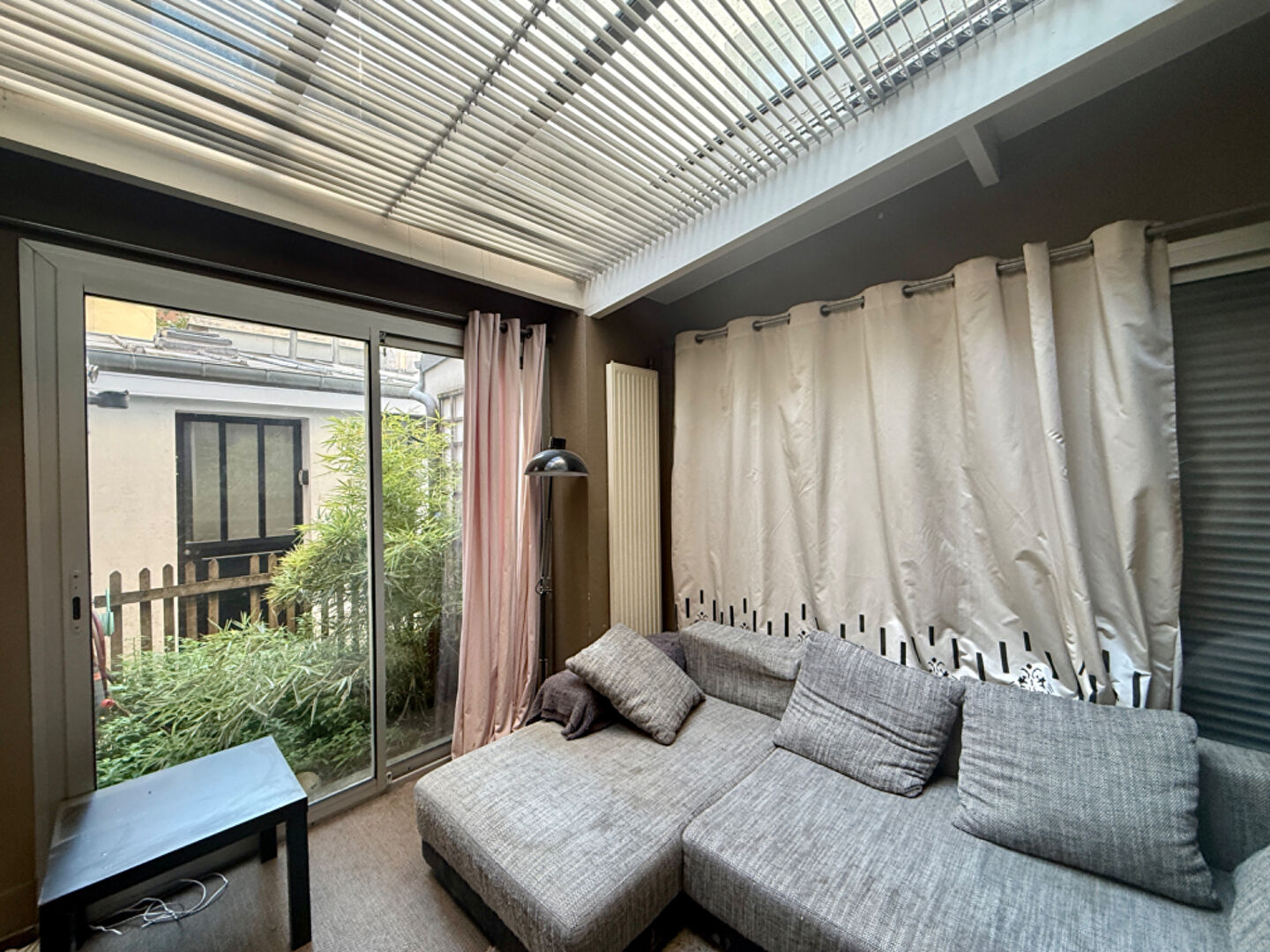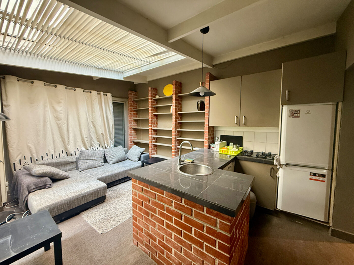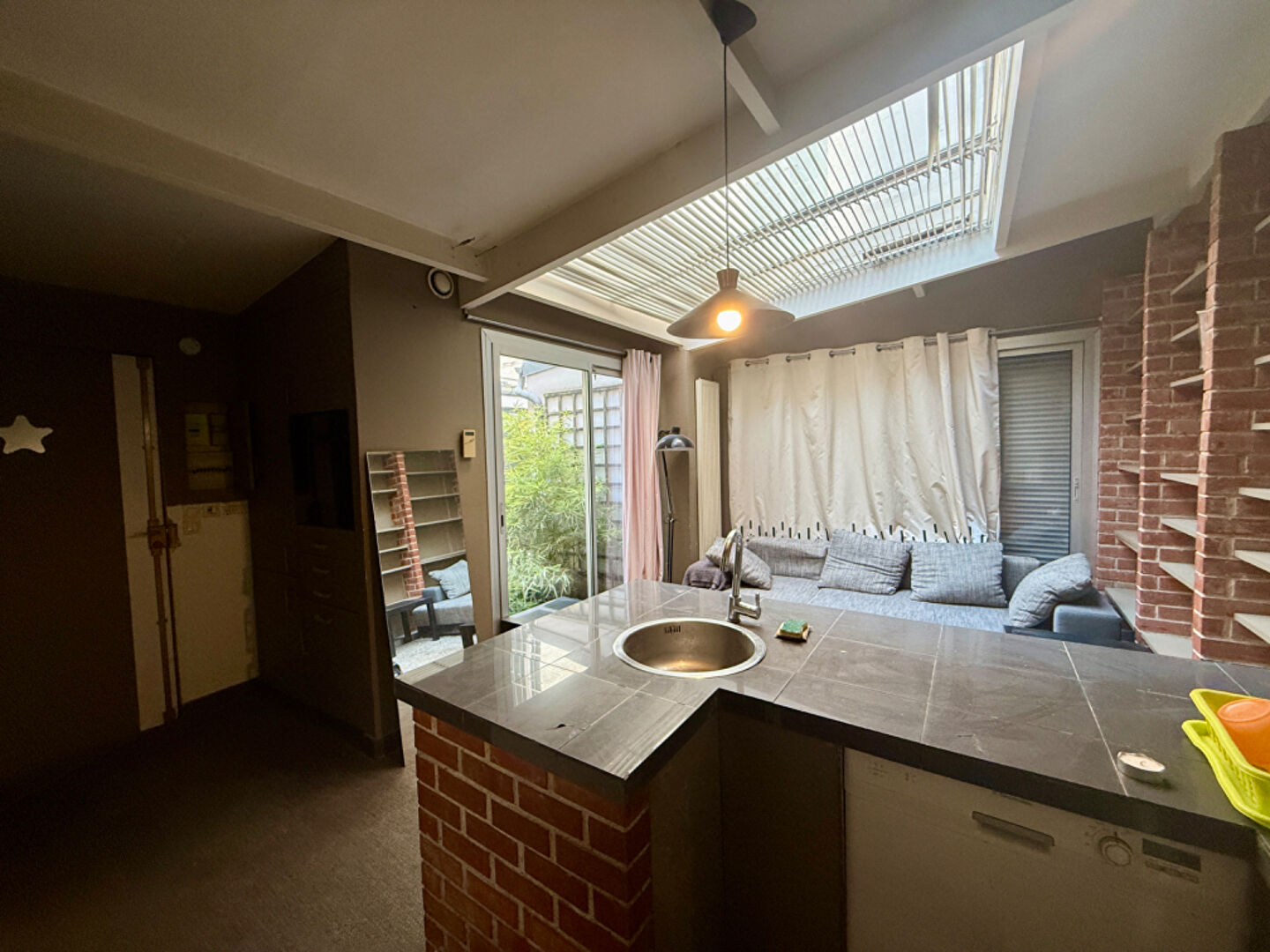 D'une surface atypique, il offre une belle pièce de vie lumineuse grâce à sa verrière, avec une cuisine américaine.