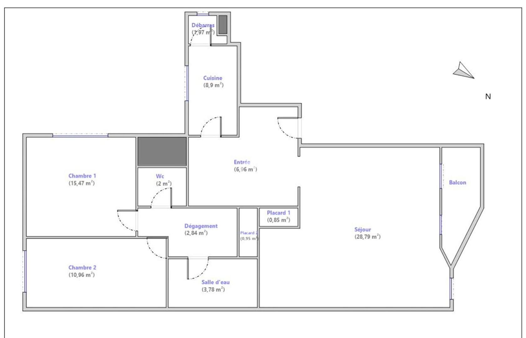 Il se compose d'une entrée avec placard, d'un séjour double ouvrant sur une petite terrasse de plus de 6 m², d'une cuisine séparée, de deux chambres, d'une salle d'eau et de WC indépendants.