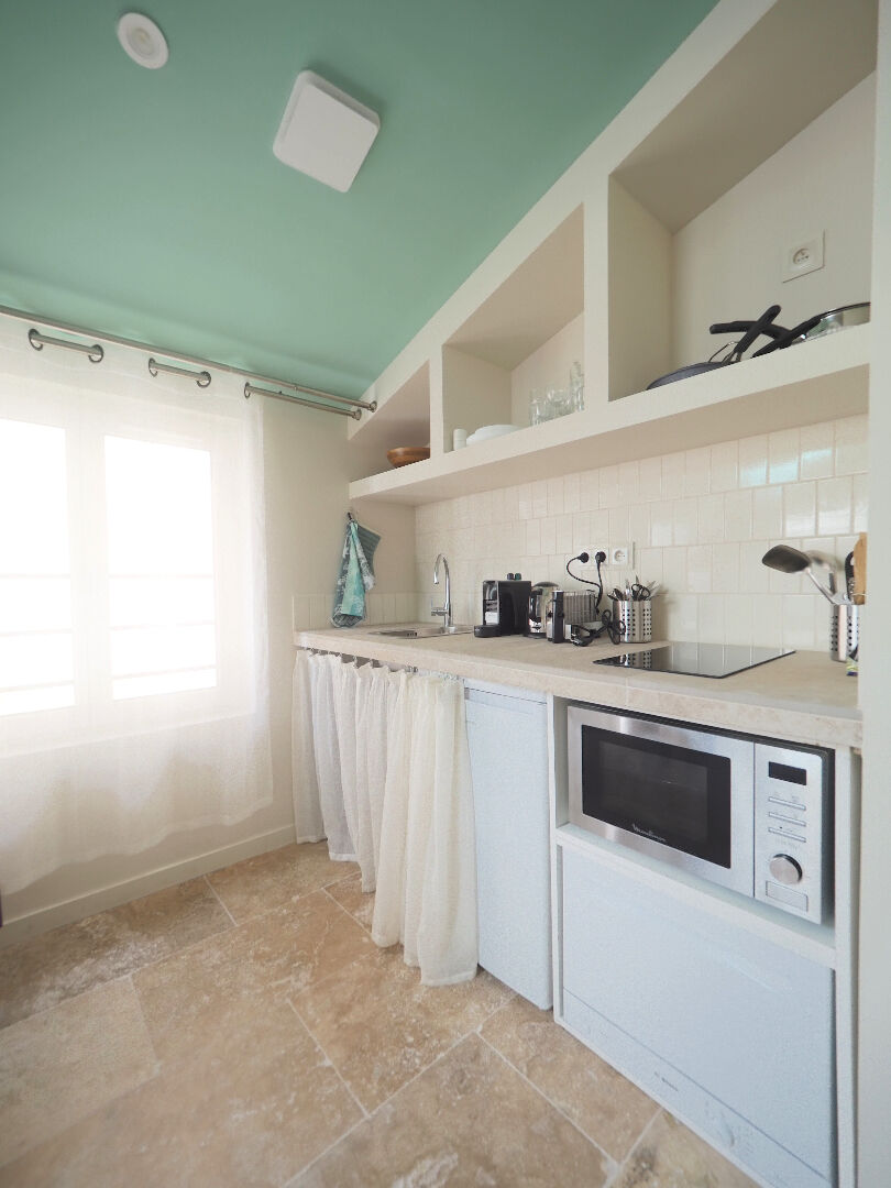 Au premier et dernier étage d'une maison avec cour privée et végétalisée, face à la plus belle vue de Paris selon Time Out et ZigZag, élégant studio rénové par architecte comprenant un dégagement, placards, salle de douche avec wc, une pièce de vie claire avec poutres donnant sur la cour pavée fleurie, une cuisine toute équipée (machine à laver séchante, lave-vaisselle, réfrigérateur-congélateur, four).