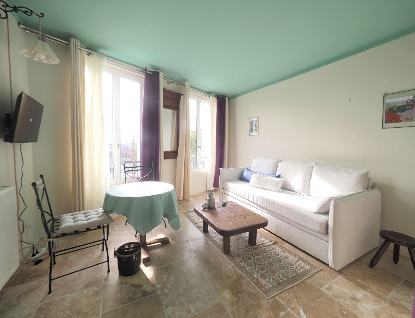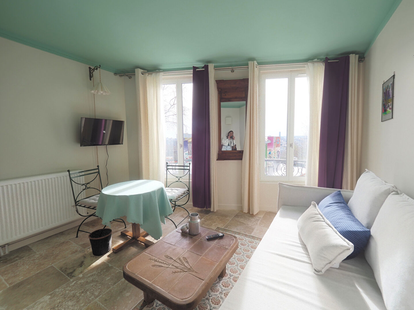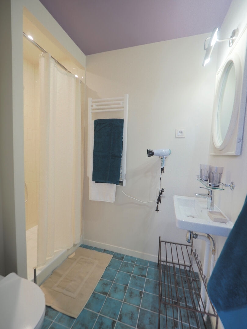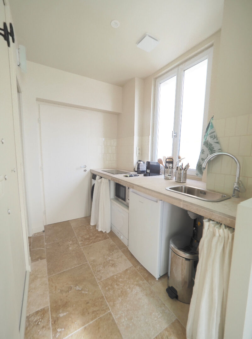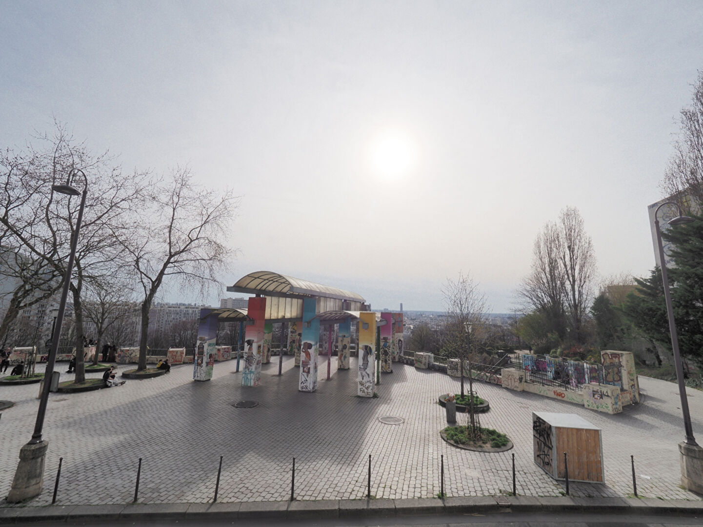 Au premier et dernier étage d'une maison avec cour privée et végétalisée, élégant studio rénové par architecte comprenant une entrée avec cuisine équipée (machine à laver séchante, lave-vaisselle, réfrigérateur-congélateur, four), une pièce de vie lumineuse face au belvédère du Parc de Belleville et une salle de douche avec wc, rangements.