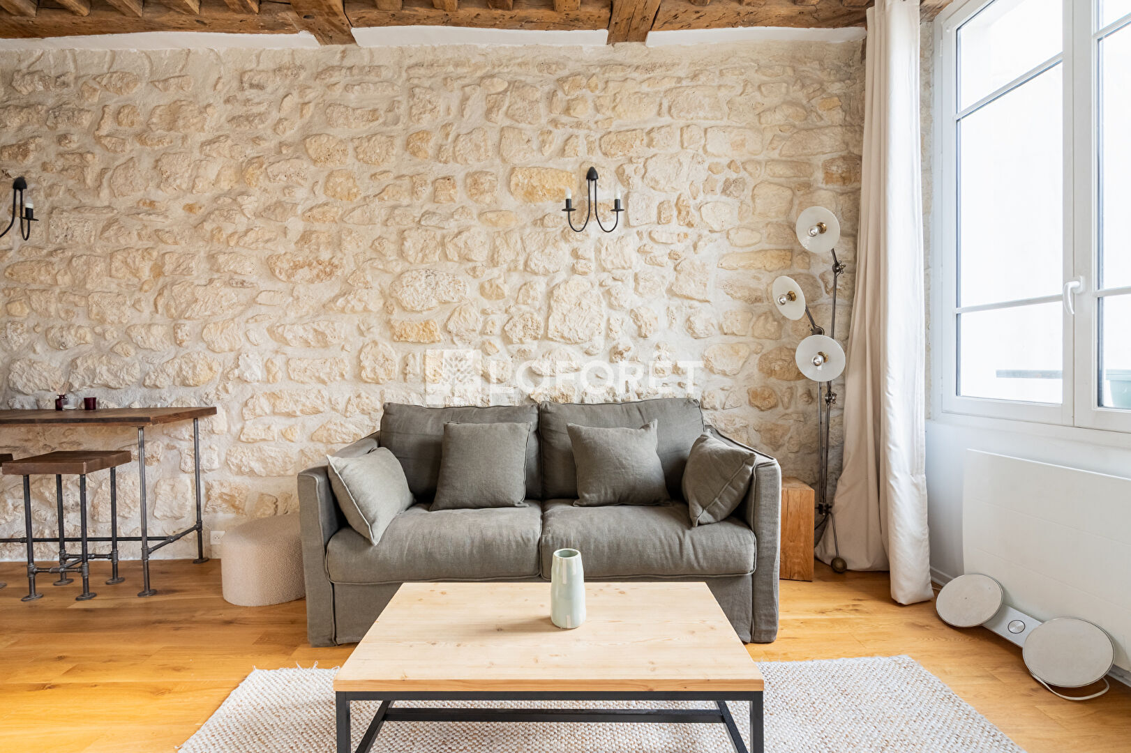 Au 3ème étage d'un immeuble ancien bien entretenu, cet appartement exposé plein sud bénéficie d'une remarquable luminosité et d'une hauteur sous plafond de plus de 3 mètres, sublimée par de magnifiques murs en pierre apparente.