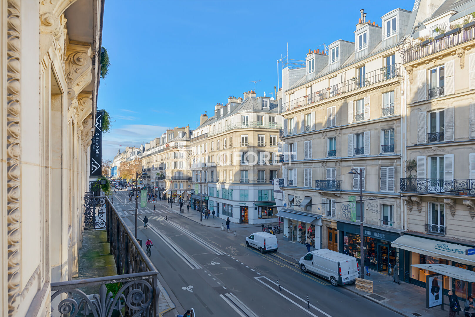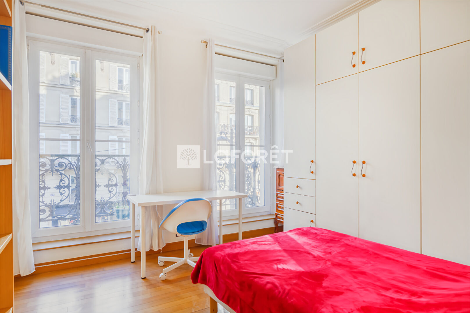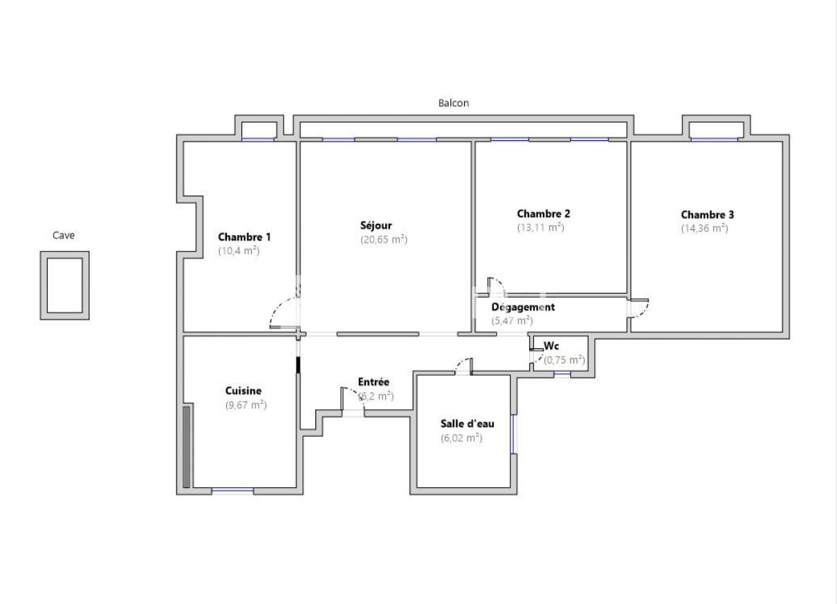 Un couloir dessert une grande salle d'eau, un WC séparé, une deuxième chambre de 13 m² avec accès au balcon filant, ainsi qu'une troisième chambre de 14,36 m² disposant également de son balcon.