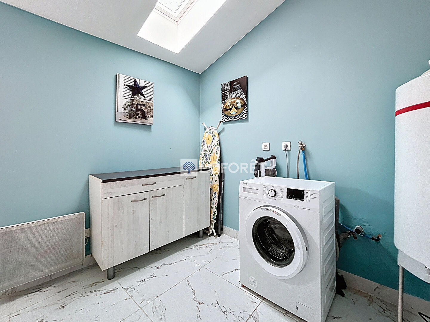 Entrée, cuisine aménagée et équipée (four, plaque gaz), salon, couloir, buanderie, salle d'eau avec wc. Porte de service vers terrasse à l'arrière.