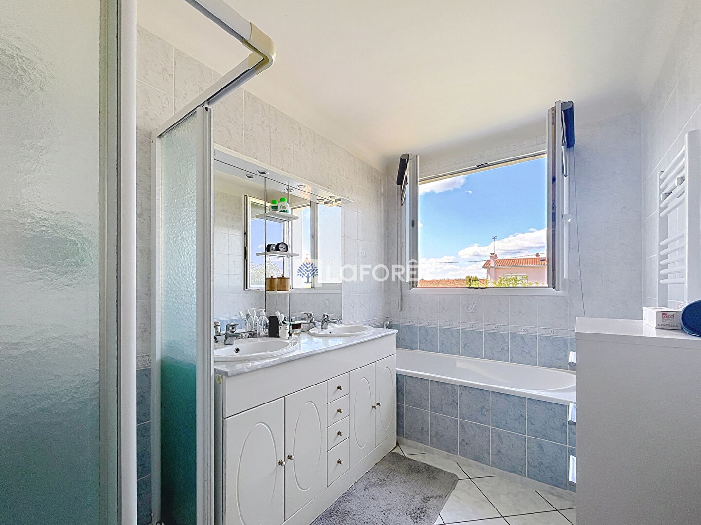 En demi-niveau : 2 chambres avec placards muraux, salle de bain (baignoire, douche et meuble double vasques, wc indépendants.