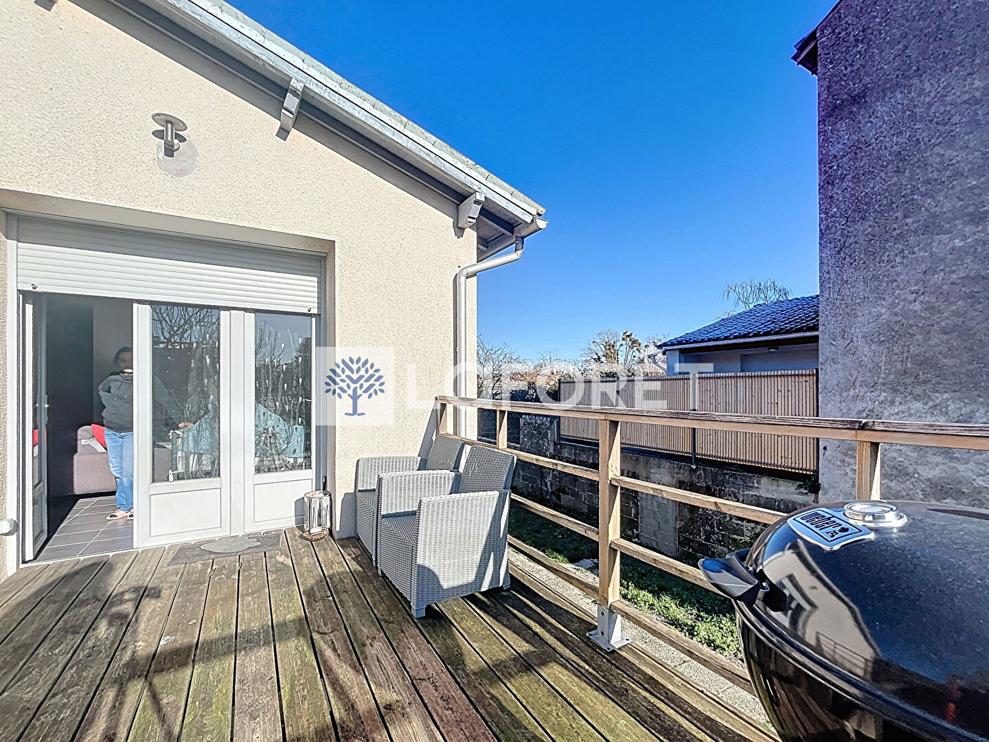 À l'extérieur, une terrasse sur pilotis vient compléter l'ensemble et apporte un cachet à la maison.
