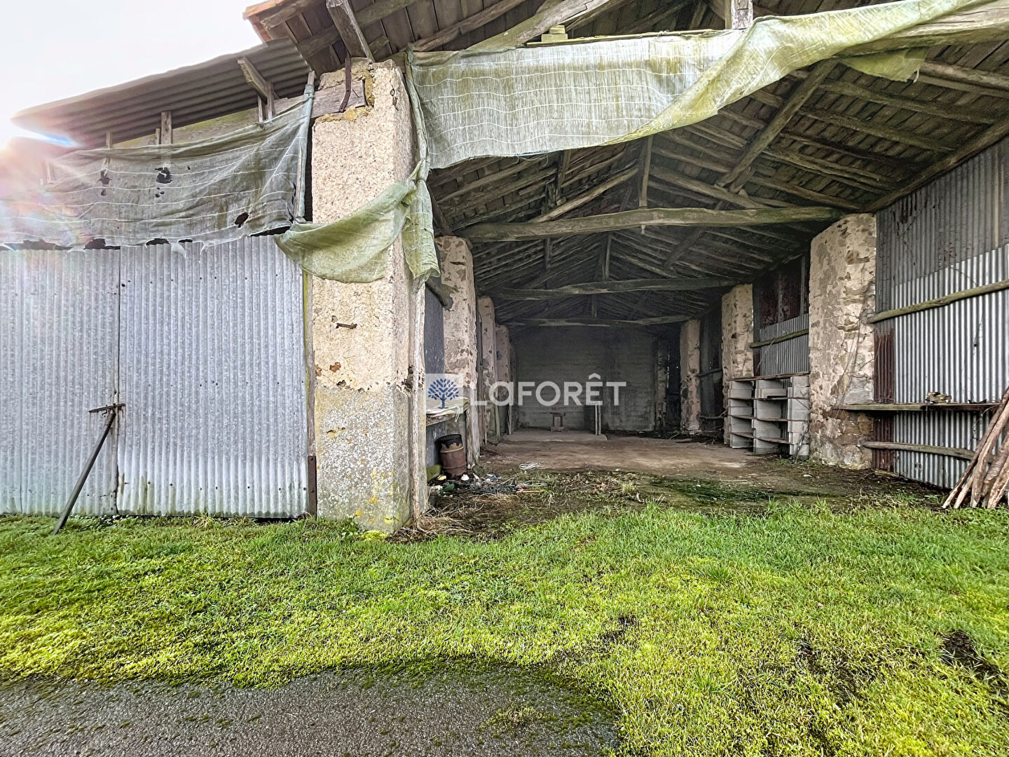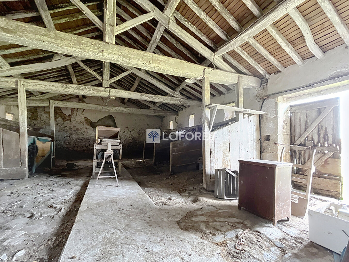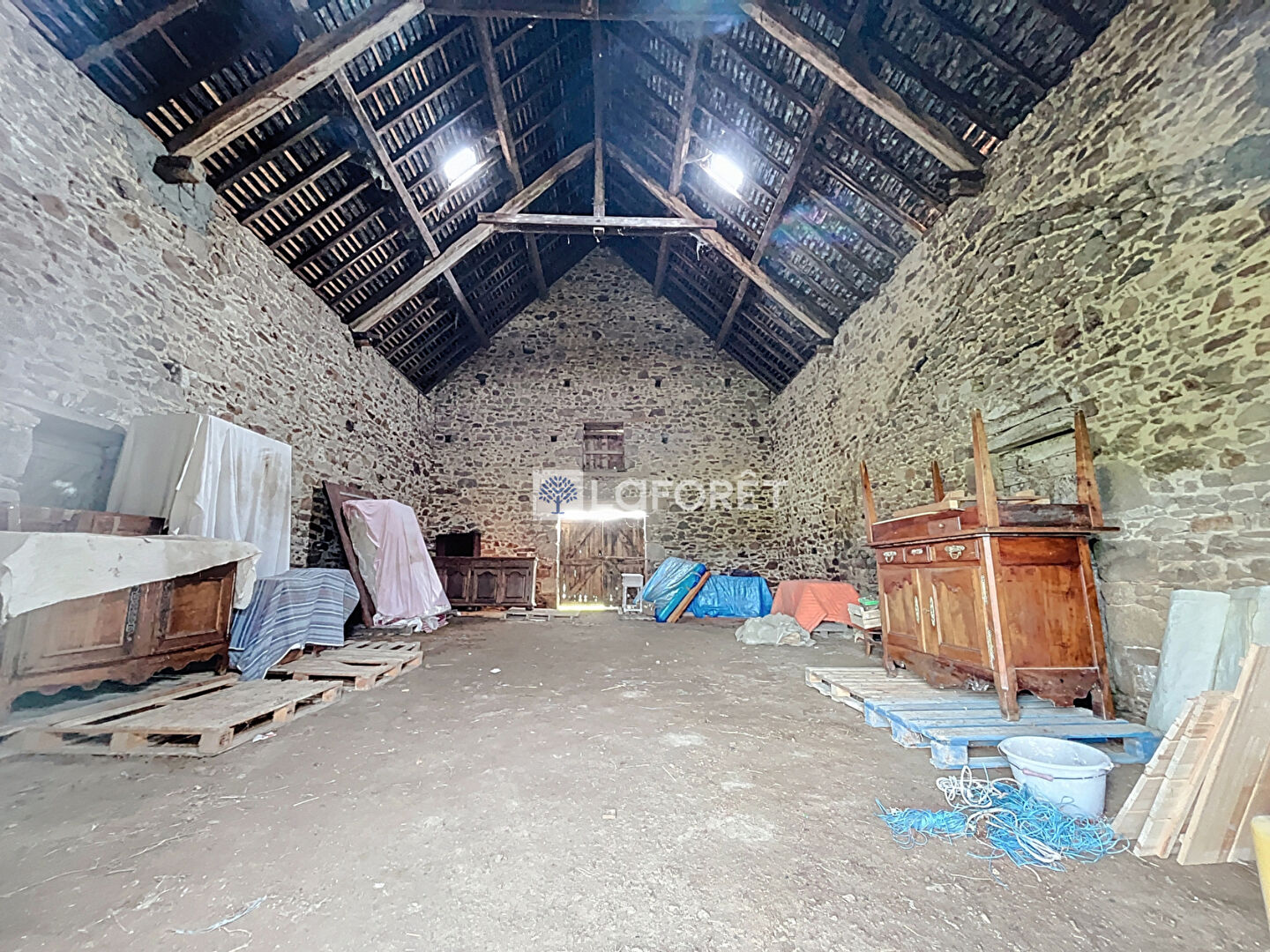 Grange déclassée (changement de destination accordé) pouvant être transformée en habitation : environ 97 m² au sol, belles ouvertures (H. 4,21 m / L. 3,50 m), toiture en ardoises